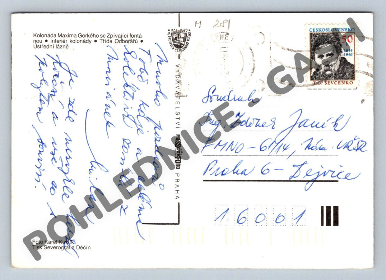 Originální pohlednice Mariánské Lázně s více záběry významných lázeňských budov a kolonády Maxima Gorkého. Na fotografiích jsou zachyceny známé památky, fontána, kolonáda i secesní architektura města. Na zadní straně je klasické rozvržení pro adresu a text s poštovním razítkem a známkou. Pohlednice byla odeslána, obsahuje ručně psaný vzkaz a dobovou známku z Československa s portrétem T. G. Ševčenka. Jedná se o sběratelský kousek ilustrující atmosféru slavných českých lázní.