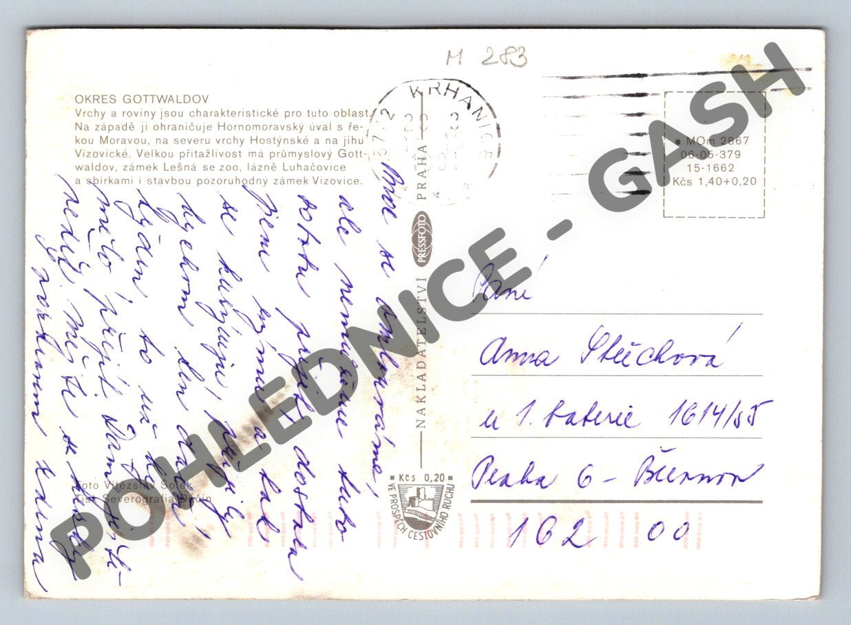Originální víceobrázková pohlednice s názvem Gottwaldovsko zachycuje různé významné lokality někdejšího okresu Gottwaldov (dnes Zlín a okolí). Na přední straně jsou koláže fotografií míst jako Gottwaldov, Otrokovice, Napajedla, Lešná, Vizovice, Luhačovice a Valašské Klobouky. Pohlednice obsahuje rovněž erby měst a regionální mapku Jihomoravského kraje. Na zadní straně je textový popis charakteristik okresu, rukopisné věnování a poštovní razítko s datem odeslání. Velmi hezký sběratelský kousek s atmosférou doby a regionální historií. Stav dle foto, běžné opotřebení odpovídající stáří.