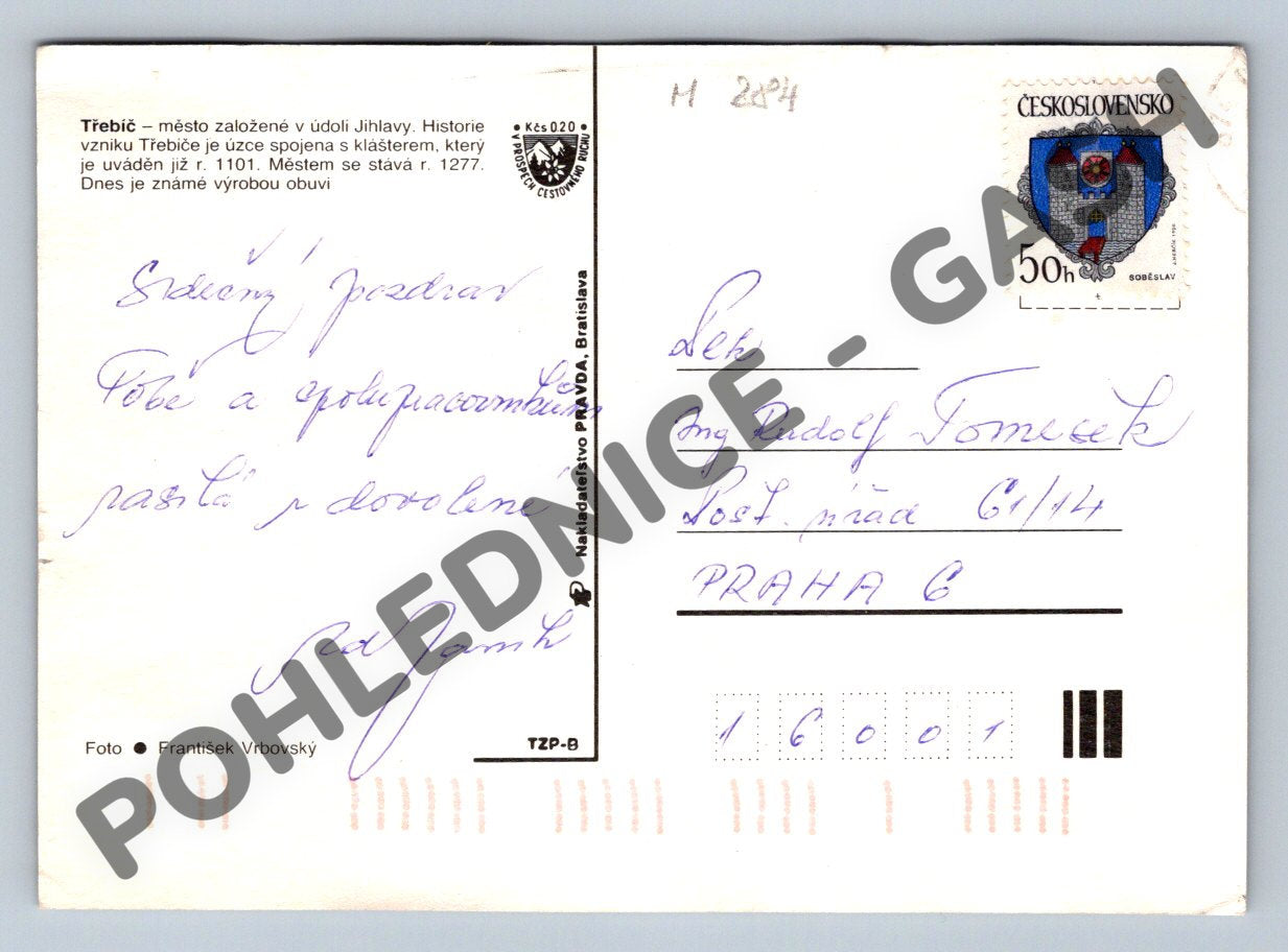 Originální pohlednice města Třebíč s koláží několika známých městských motivů, včetně historických i moderních budov a větrného mlýna. Na přední straně najdete ikonické památky a městské scenérie zachycené živými barvami. Zadní strana obsahuje ručně psaný pozdrav, poštovní známku Československo (50 h Soběslav) i jasně čitelnou adresu a poštovní razítko. Pohlednice je vhodná pro sběratele historických čs. pohlednic a zájemce o jihomoravský region.