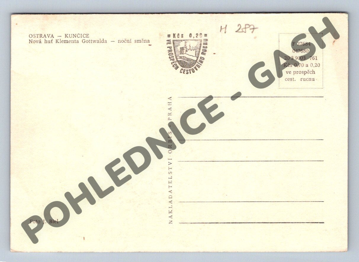 Originální černobílá pohlednice s motivem oceláren – Ostrava-Kunčice, Nová huť Klementa Gottwalda během noční směny. Pohlednici vydalo nakladatelství Orbis v Praze, autorem fotografie je J. Biel. Na zadní straně pohlednice je věnování prostoru pro známku a dopisní text. Zajímavý pohled na průmyslové dědictví Ostravy v minulém století, vhodné pro sběratele pohlednic a zájemce o industriální historii ČR.