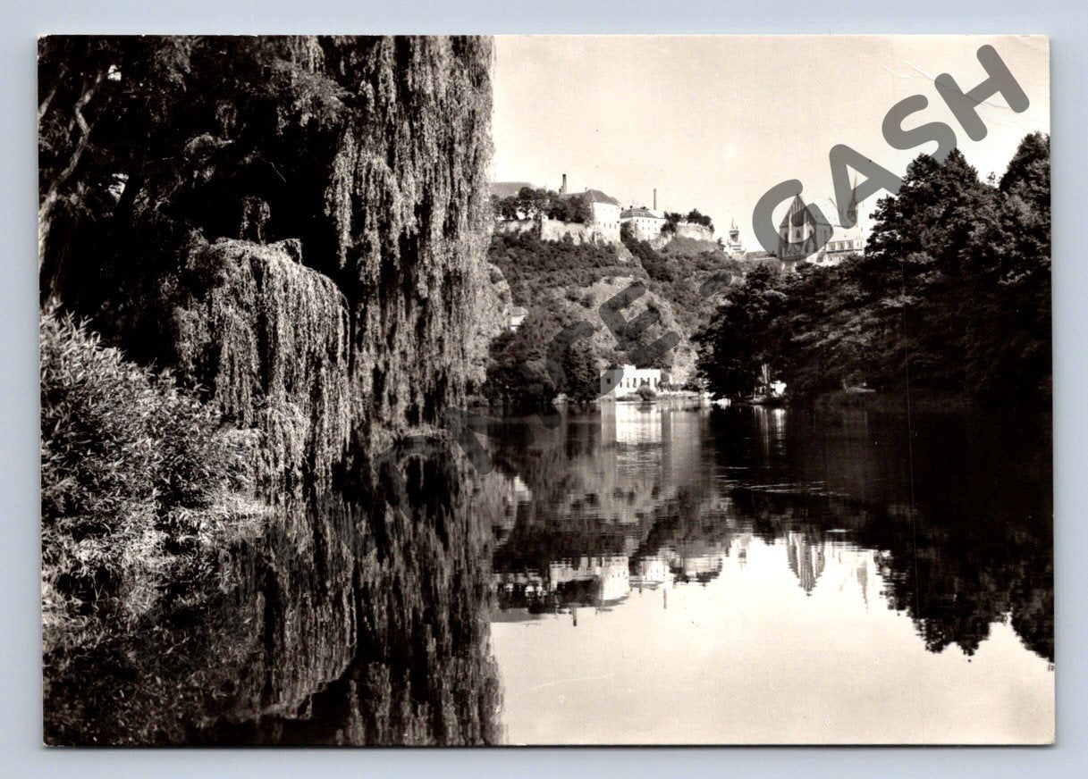 Originální černobílá pohlednice zachycující část starobylého Znojma nad údolní stráně Dyje. V popředí se odráží koruny stromů na hladině řeky a v dálce je možné vidět dominanty města: gotický chrám sv. Mikuláše ze 14.-15. století a nalevo opevněný zámek, dnes sídlo jihomoravského muzea. Pohlednice je neprošlá poštou, s detailním popisem na zadní straně, vydaná nakladatelstvím Orbis, Praha. Foto: J. H. Toman. Starožitný kousek vhodný pro sběratele a milovníky historie českých měst a architektury.