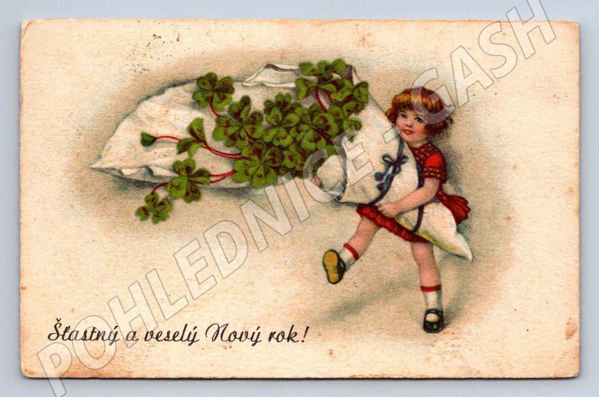 Starý novoroční přání pohlednice s dívkou a čtyřlístky