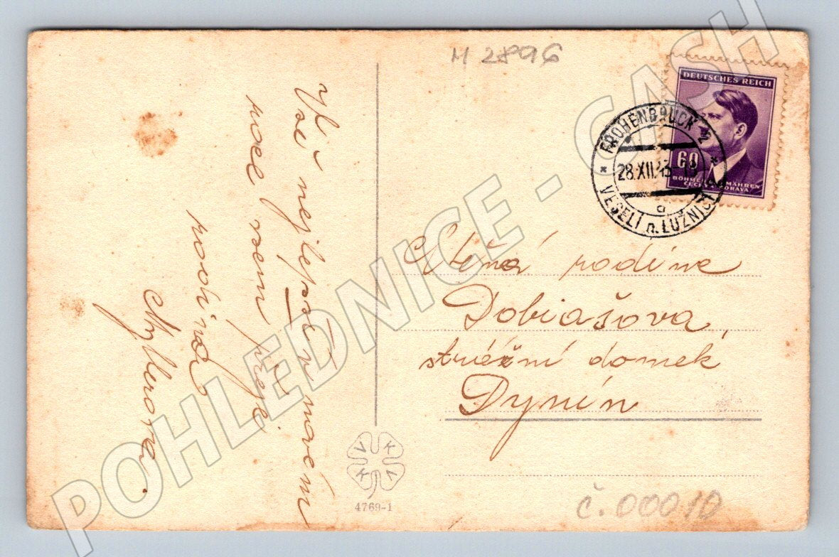 Pohlednice staršího data s motivem dívky nesoucí kytici čtyřlístků a textem Šťastný a veselý Nový rok! . Pohlednice je opatřena českým novoročním přáním, razítkem i známkou z období Německé říše, což dodává historickou hodnotu. Na zadní straně je rukopisné psaní a adresa, což zvyšuje autentičnost a sběratelskou hodnotu tohoto kousku. Ideální položka pro sběratele starých pohlednic a milovníky osobní historické korespondence.