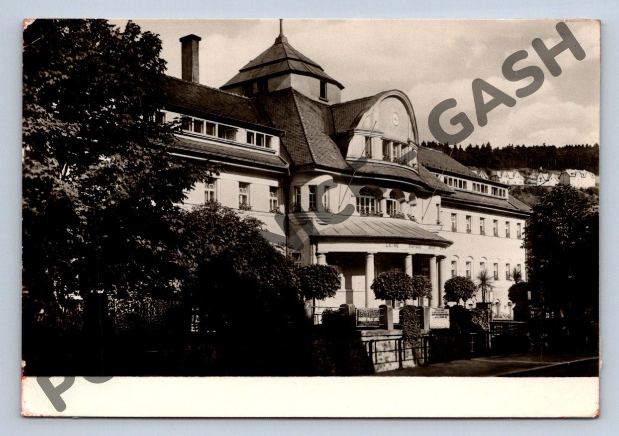 Starší pohlednice s motivem významné budovy v Jáchymově. Pohlednice je použita s poštovní známkou a razítkem Jáchymov, na zadní straně je ručně psaný vzkaz adresovaný do Prahy. Pohlednice má známky opotřebení, rohy jsou mírně ohnuté, na zadní straně jsou skvrny od stáří. Vhodné pro sběratele historických pohlednic z České republiky, především s tématikou architektury a lázeňských měst. Přibližné datování: před rokem 1950.