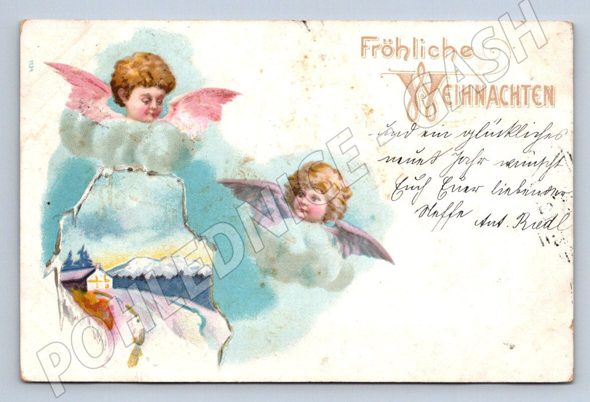 Nabízím starou vánoční pohlednici s motivem dvou andílků s růžovými křídly, plovoucích na obláčcích. Pohlednice je doplněna nápisem Fröhliche Weihnachten (Veselé Vánoce) a obsahuje ručně psaný text. V levém dolním rohu je malovaný zimní horský výjev se zasněženými stromy a domem. Pohlednice je adresována a opatřena poštovní známkou i razítkem, což dokládá její autentické využití. Pohlednice je ve vintage stavu s viditelnými známkami stáří a drobným opotřebením, které přidávají na její historické hodnotě a autentičnosti. Ideální kategorie pro sběratele vánočních a historických pohlednic s osobnostním a kulturním nádechem.