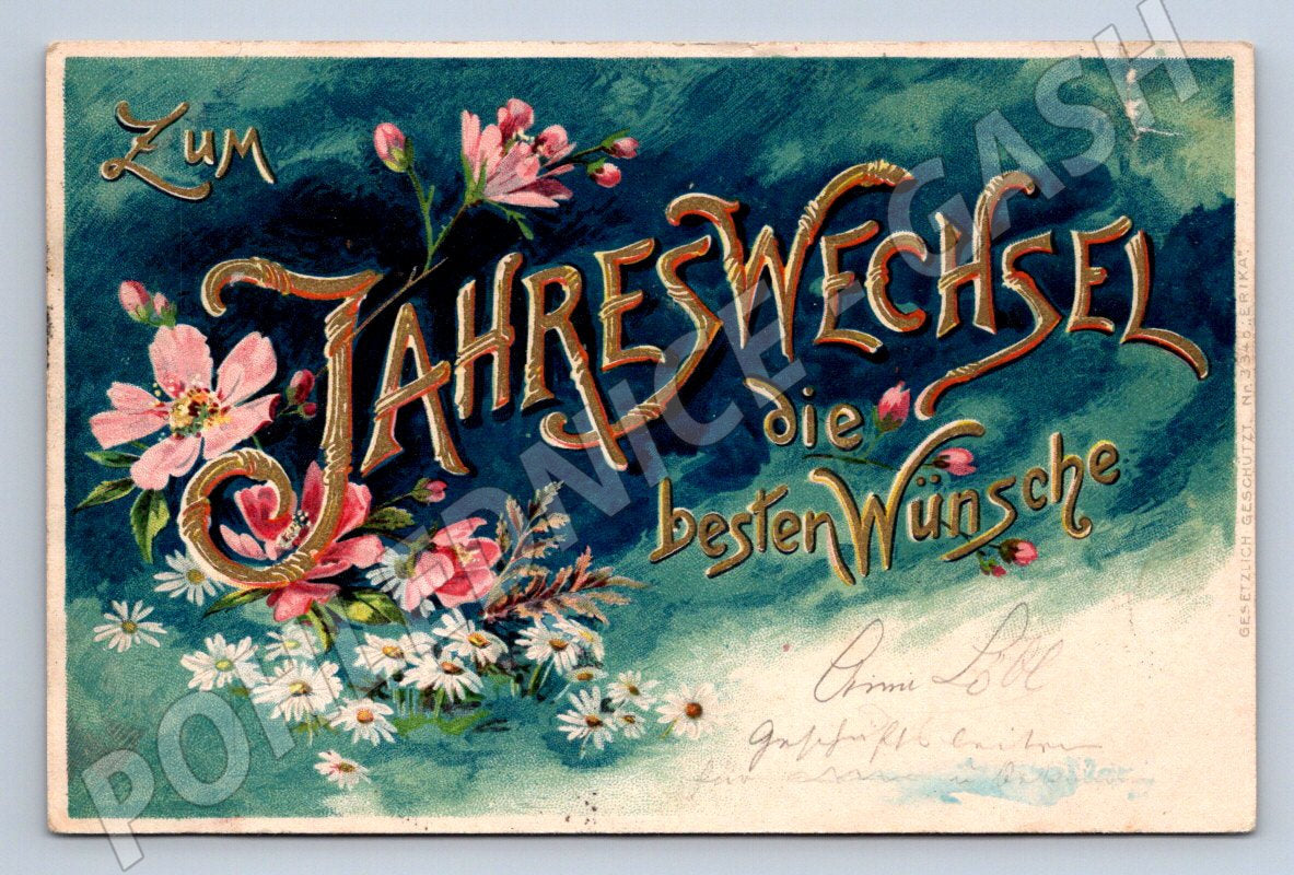 Nabízím k prodeji starou pohlednici s německým nápisem Zum Jahreswechsel die besten Wünsche , což znamená Nejlepší přání k přelomu roku . Pohlednice je ilustrovaná květinovým motivem ve svěžích barvách a zlatavých nápisech. Zadní strana pohlednice obsahuje několik ručně psaných slov a razítka poštovních známek, což svědčí o jejím použití. Pohlednice má známky stáří, ale je v dobrém stavebním stavu s jemnými známkami opotřebení typickými pro staré papírové předměty. Ideální pro sběratele historických pohlednic nebo milovníky vintage dekorací. Velký formát, vhodná k vystavení i sběru.