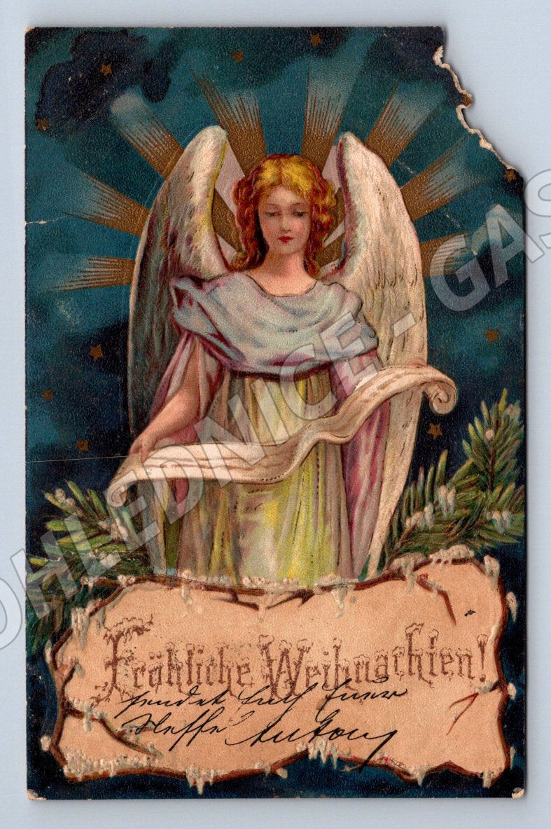 Nabízím starou vánoční pohlednici s motivem anděla držícího svitek s německým nápisem Frohe Weihnachten (Veselé Vánoce). Pohlednice je opatřena starou známkou v hodnotě 5 heller a poštovním razítkem. Písemný pozdrav je ve staré německé gotické kurzívě. Pohlednice je jemně opotřebovaná, okraj má nenápadné oděrky a chybějící kousek na spodním rohu, což odpovídá její stáří a autenticitě. Velmi zajímavý a vyhledávaný sběratelský kousek s vánoční tématikou a historickým nádechem.