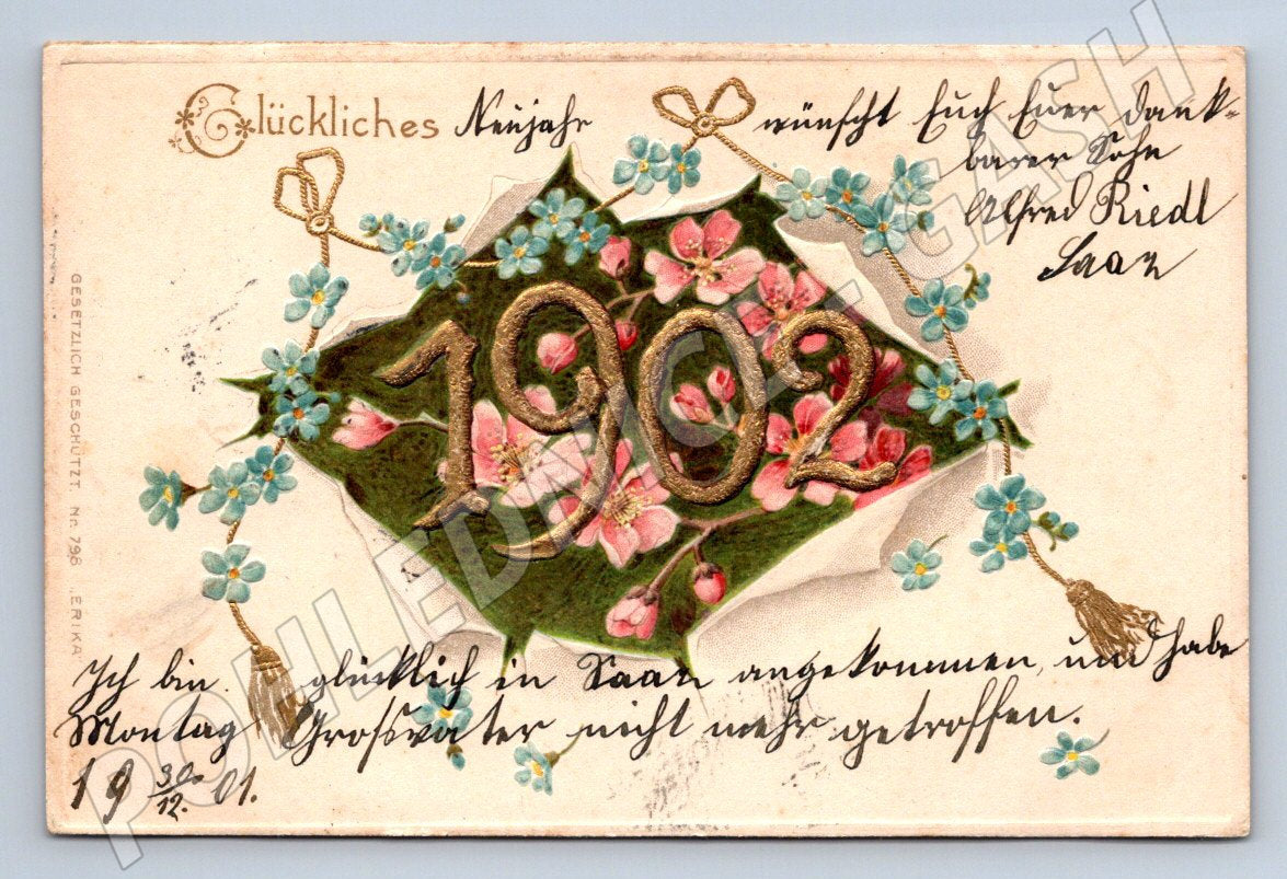Nabízím k prodeji starou pohlednici z roku 1902 s novoročním motivem. Pohlednice je ilustrována květinovou kompozicí s číslem roku 1902, doprovázena ručním písmem v němčině. Na zadní straně je známka a poštovní razítko, s adresou adresáta psanou stylovým historickým písmem. Pohlednice je v dobrém stavu s viditelnými známkami stáří, vhodná pro sběratele starých pohlednic a milovníky historických dokumentů. Velikost a formát malé pohlednice odpovídají běžným výrobním standardům té doby.