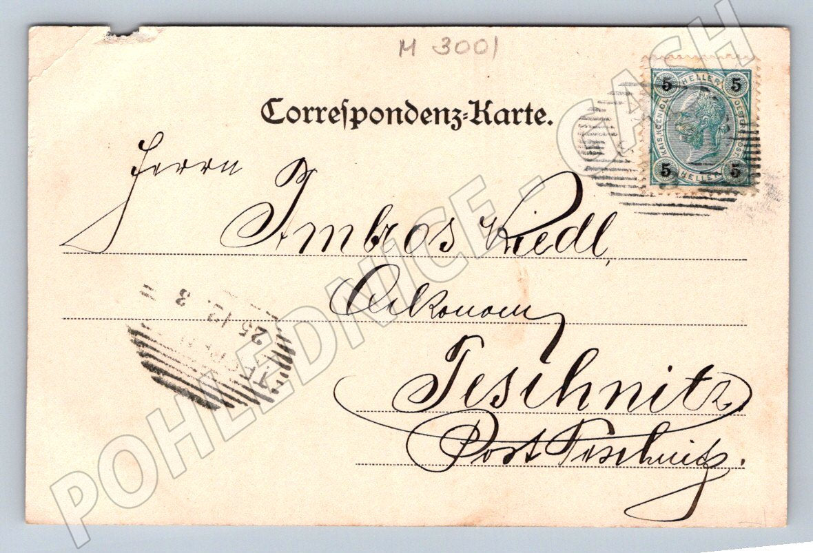 Jedná se o starou pohlednici z města Saaz (dnešní Žatec) zobrazující náměstí Ringplatz v zimním období s vánočními motivy. Na pohlednici jsou zachyceni andělé držící knihu, vánoční stromek se svíčkami a dárky, což podtrhuje vánoční atmosféru. Pohlednice je opatřena poštovní známkou s nominálem 5 heller a psaným adresátem, což naznačuje její použití jako vánoční pozdrav. Tento typ pohlednice je vhodný pro sběratele starých českých vánočních pohlednic a milovníky historických městských motivů. Stav pohlednice je zachovalý s viditelnými známkami stáří.