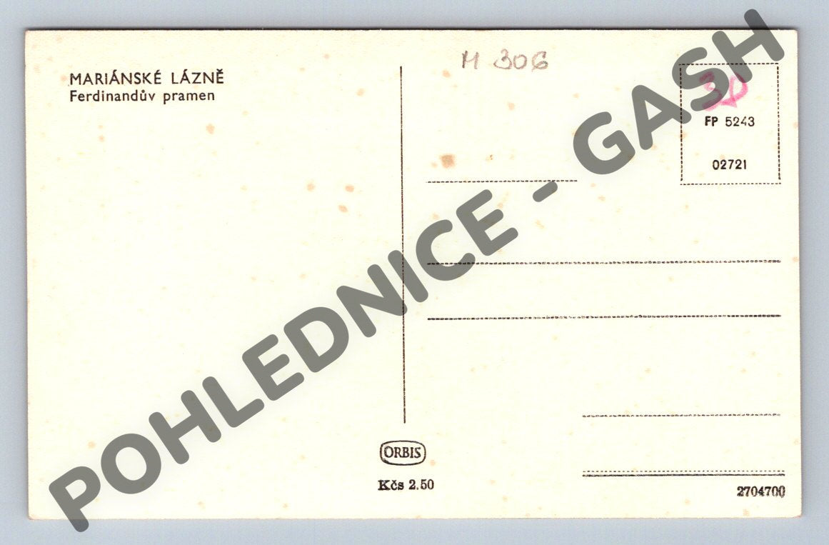 Originální historická pohlednice zobrazující Ferdinandův pramen v Mariánských Lázních. Na přední straně pohlednice je krásná černobílá fotografie kolonády a okolního parku s korzujícími lidmi. Zadní strana je nevyplněná, pouze s drobnými skvrnami stáří, výrobcem ORBIS a cenou 2,50 Kčs. Pohlednice je ve velmi dobrém sběratelském stavu a představuje krásný pohled do historie československého lázeňství. Rozměr klasického malého formátu, vydání pravděpodobně před rokem 1950.