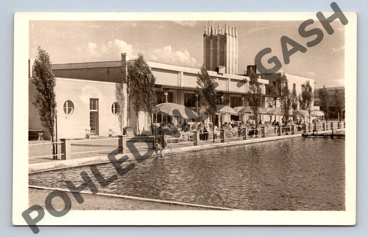 Nabízím originální starou pohlednici Mariánské Lázně – Koupaliště Riviera. Na přední straně pohlednice je vyobrazen modernistický areál známého koupaliště s bazénem, slunečníky a posezením pro návštěvníky. Jedná se o krásný dobový snímek s typickou architekturou. Pohlednice je ve velmi dobrém stavu, bez zásadního poškození. Na zadní straně je uveden název a vydavatel ORBIS, stejně jako dobové známky a prostor pro adresu. Skvělý sběratelský kus z období první poloviny 20. století.