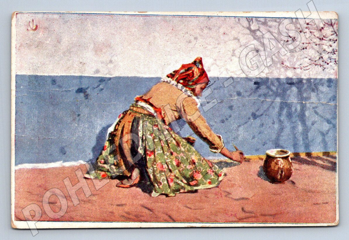 Nabízím starou pohlednici Iljička Uprky s názvem Obrounávačka , která zachycuje ženu v tradičním kroji při obrounávání keramické nádoby. Pohlednice je z období Československa, potvrzená původní známkou a rukopisným textem na zadní straně adresovaným paní Anně Feurelové. Jedná se o zajímavý etnografický motiv dokumentující folklór a tradiční řemesla. Pohlednice je v dobrém stavu, vhodná pro sběratele a milovníky české kultury.