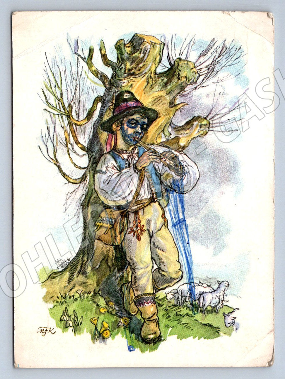 Starší pohlednice s kresbou muže v tradičním lidovém kroji hrajícího na píšťalu. Scéna je umístěna u starého pařezu s venkovskou atmosférou, doplněná malovanými kuřátky a zajíčky. Na zadní straně je ručně psaný text a přání Veselé velikonoce . Pohlednice je zachovalá s lehkými známkami opotřebení na rozích. Ideální sběratelský kousek pro milovníky etnografie a lidové kultury.