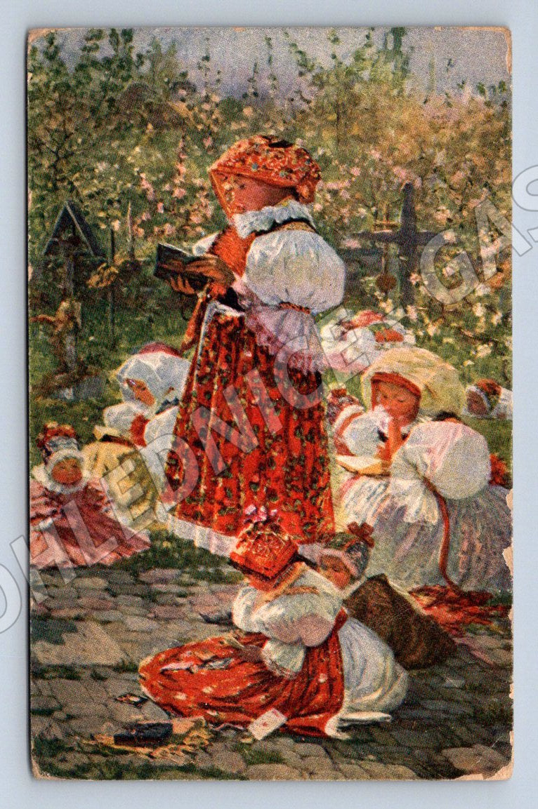 Tato pohlednice zobrazuje obraz Joži Úprky s názvem Na hřbitově , který představuje dívky v tradičních moravských krojích na hřbitově. Pohlednice je opatřena rukopisným věnováním a datací 27/5 13 , což svědčí o jejím stáří a historické hodnotě. Jedná se o autentický kus české etnografické a umělecké historie, vhodný pro sběratele pohlednic, zájemce o lidovou kulturu a malířství.