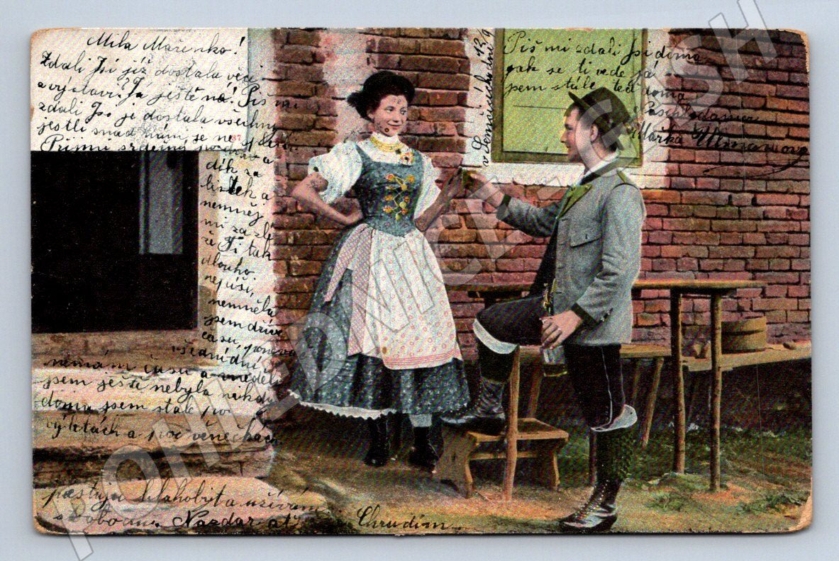 Originální barevná etnografická pohlednice z počátku 20. století zachycující muže a ženu ve tradičních krojích s ručně psaným textem přes celou fotografii. Pohlednice byla odeslána z Dobřenic, což potvrzuje razítko poštovní známky z té doby. Motiv ekologicky dokumentuje tradiční lidový oděv a atmosféru venkovského života, vhodné pro sběratele pohlednic, etnografie a historických artefaktů.