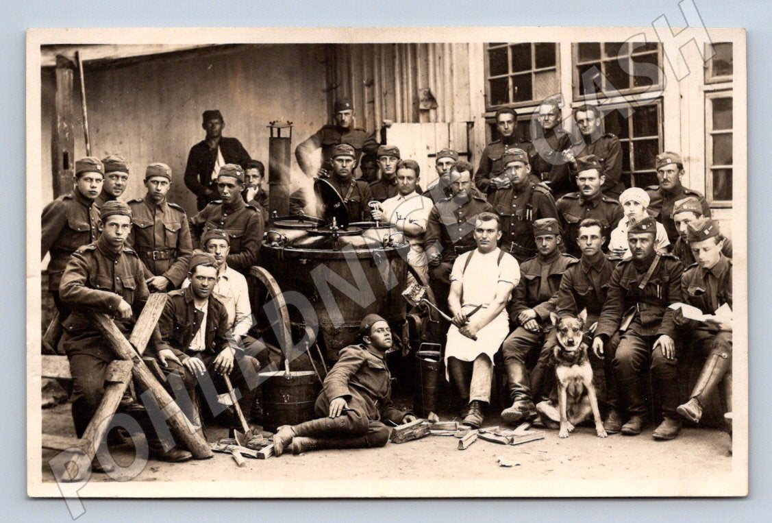 Historická černobílá pohlednice zobrazující skupinu vojáků ve vojenských uniformách se psem a dvěma muži v bílých uniformách, pravděpodobně kuchaři či číšníky, stojícími u velkého kotle. Fotografie působí dobově, s vojenskou tématikou ze začátku 20. století, zachycující vojenský život a zázemí. Pohlednice je v zachovalém stavu, bez textu nebo známek na rubové straně.