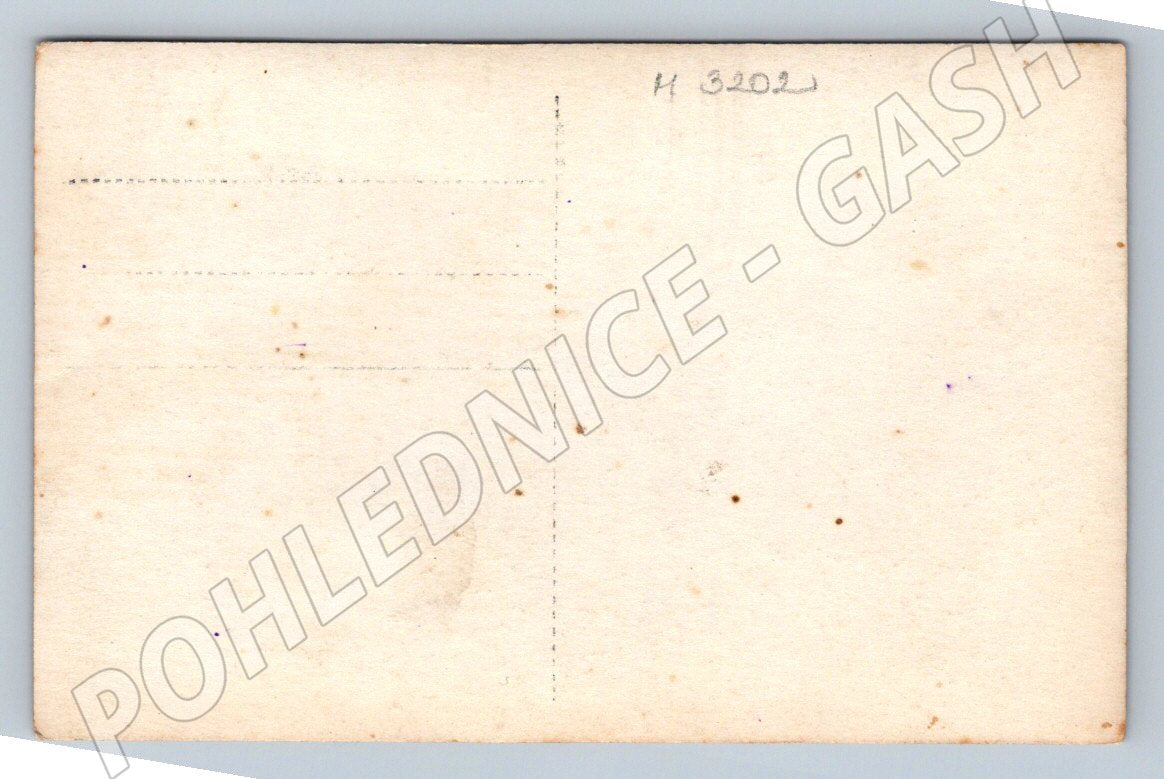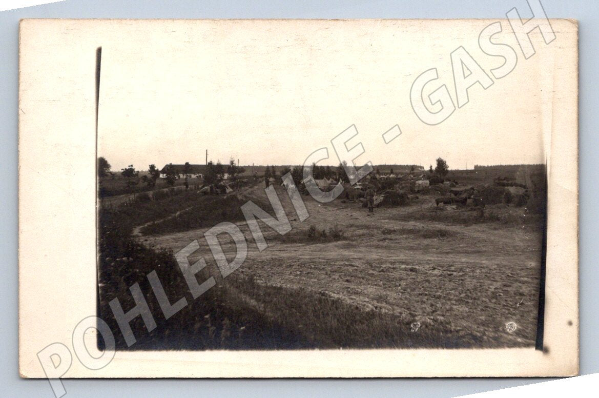 Tato historická pohlednice zobrazuje venkovskou krajinu s rozlehlým polem a cestou, po níž prochází několik osob a vozy tažené koňmi. Na obzoru jsou patrné stany a nízké budovy, což naznačuje dočasné osídlení nebo vojenský tábor. Černobílá fotografie má starší charakter a pohlednice nemá žádný tištěný text ani razítka, což ji činí zajímavým sběratelským kouskem. Pohlednice je v původním stavu, s drobnými známkami opotřebení a zažloutnutím papíru, typickými pro starší doklady z první poloviny 20. století. Ideální pro sběratele historických pohlednic s venkovskou či vojenskou tématikou.