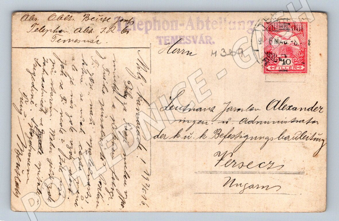 Nabízím k prodeji starou pohlednici zobrazující skupinu vojáků a žen v době Rakouska-Uherska. Pohlednice je opatřena razítkem a poštovní známkou z roku 1916, zaslaná do maďarského města Kersecz (dnešní Kerecseny). Fotografie na pohlednici má oválný tvar a zachycuje několik mužů v uniformách, ženy v dobovém oblečení a malé dítě, doplněné ležícím psem. Pohlednice je ve velmi zachovalém stavu s viditelnými známkami stáří a ručním psaným textem na zadní straně. Idealní sběratelský kousek pro milovníky vojenské historie a starých pohlednic z období první světové války. TELEPHON - ABTEILUNG TEMESVÁR