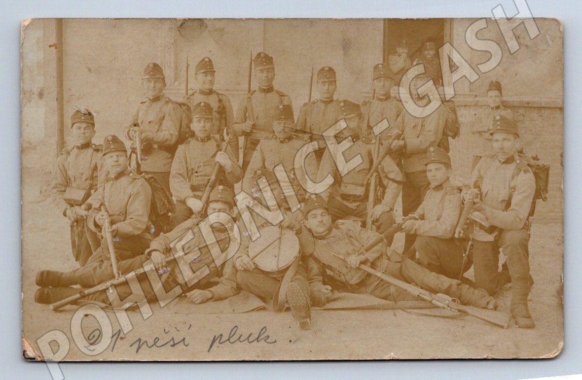 Historická vojenská pohlednice 21. pěší hudební pluk, poštovní razítko