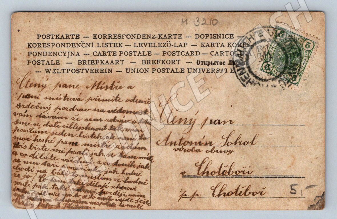 Historická pohlednice zobrazující vojenský hudební pluk sestávající z několika vojáků v uniformách se svými hudebními nástroji, včetně bubnu a různých dechových nástrojů. Pohlednice je opatřena ručně psaným věnováním a datována je poštovní známkou a razítkem z raného 20. století. Na zadní straně je text ve staročeském písmu, adresována konkrétní osobě v Chotěboři. Pohlednice je v mírně opotřebeném stavu s náznaky věku, vhodná pro sběratele vojenských a historických pohlednic. Pokud hledáte unikátní a autentický sběratelský kousek s vojenskou tematikou, tato pohlednice je ideální volbou.