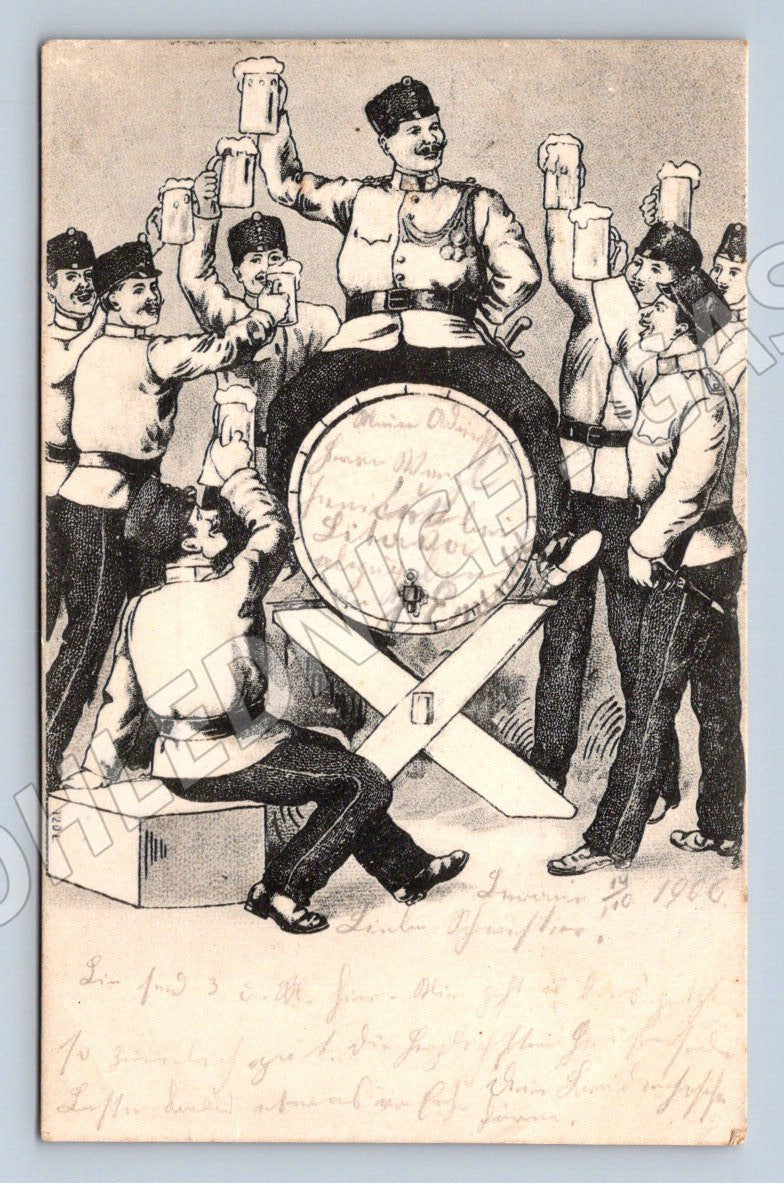 Unikátní stará pohlednice z počátku 20. století, na přední straně zobrazující skupinu mužů s pivními půllitry kolem velkého sudu a dřevěného kříže, pravděpodobně tematicky spojená s pivní tradicí nebo slavností. Pohlednice je očíslovaná 120L a obsahuje psané věnování, což zvyšuje její sběratelskou hodnotu. Na zadní straně je poštovní razítko a známka s nominální hodnotou 5 Heller, adresováno do Walgy (dnes pravděpodobně oblast v Německu). Pohlednice je v dobrém stavu vzhledem k svému stáří, s mírnými známkami používání a patinou. Ideální k doplnění sbírky starých pohlednic nebo jako zajímavý historický suvenýr.