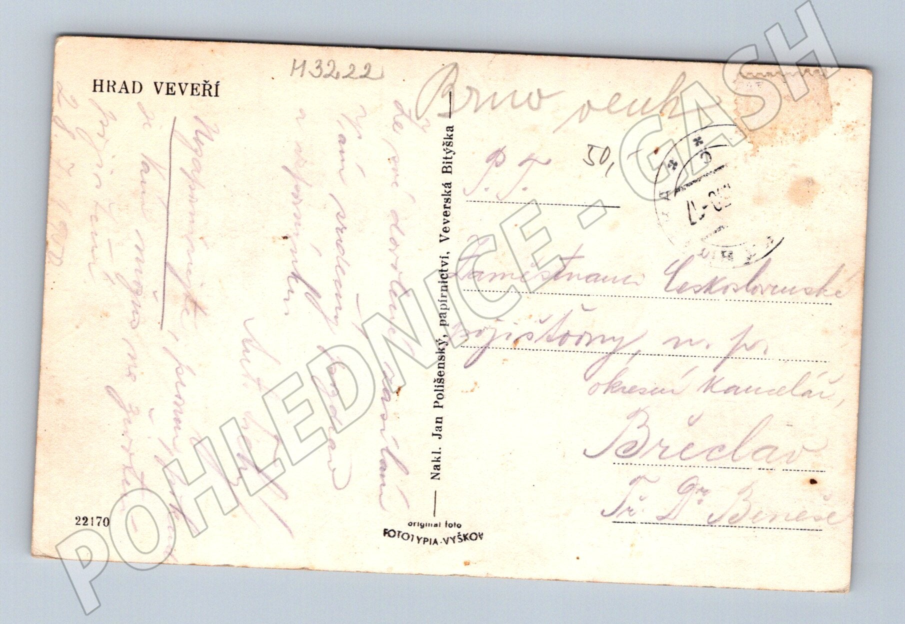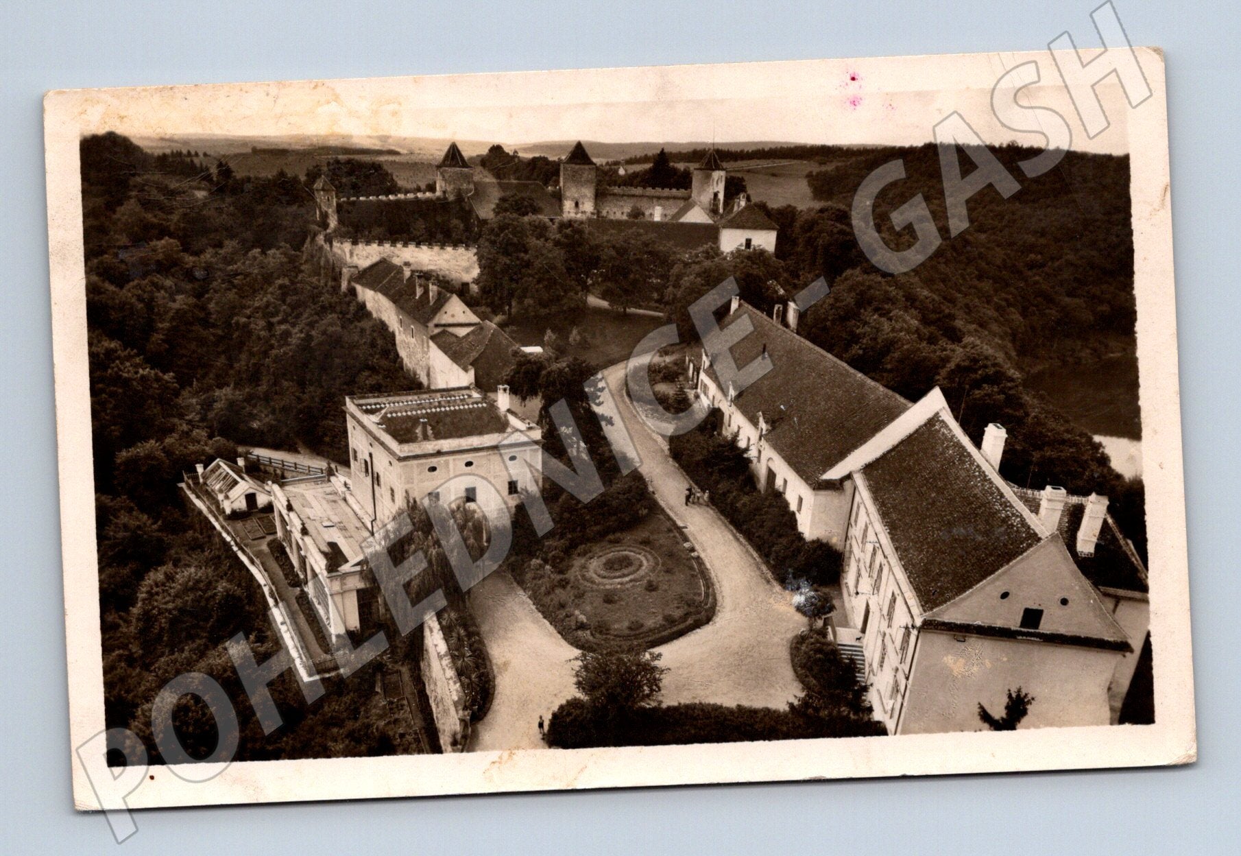 Nabízím starou pohlednici s motivem hradu Veveří. Pohlednice zachycuje krásný letecký pohled na celý areál hradu, obklopený lesy. Na zadní straně je ručně psaný text, razítko a známky použití poštou. Vydal Jan Políšenský, papírnictví, Veverská Bítýška, originální foto. Stav pohlednice odpovídá stáří – místy jsou známky opotřebení a zašpinění. Skvělý sběratelský kousek pro milovníky hradů, historie nebo starých pohlednic.