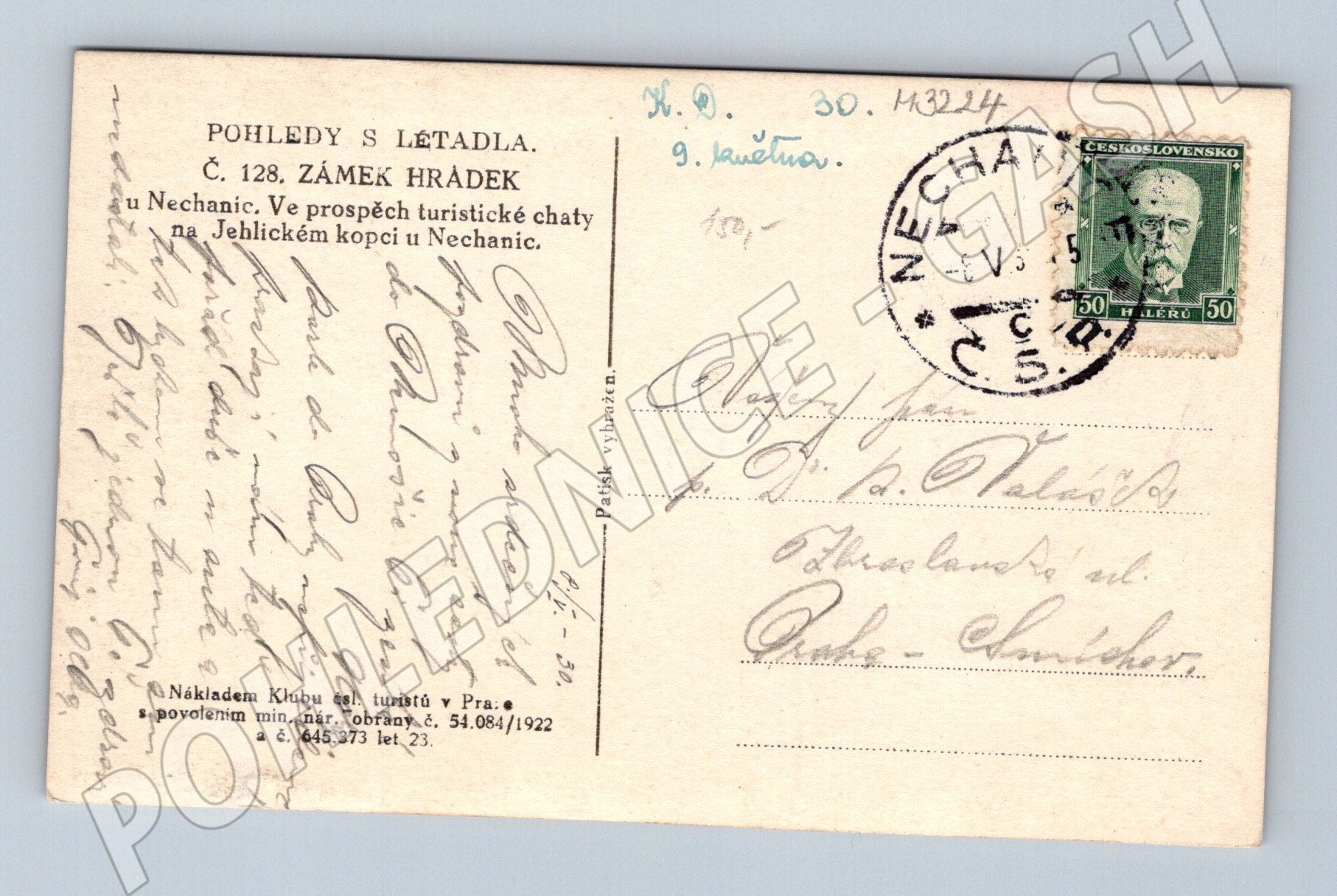 Nabízím originální historickou pohlednici s leteckým pohledem na Zámek Hrádek u Nechanic. Pohlednice byla vydána Klubem českých turistů v Praze ve prospěch turistické chaty na Jehlickém kopci u Nechanic, dle údajů na zadní straně pochází z období roku 1922. Jedná se o černobílou pohlednici s bohatě dekorovanou zahradou a unikátní architekturou zámku. Na zadní straně je pohlednice popsaná, opatřená známkou ČSR a poštovním razítkem Nechanice, 1924. Skvělý sběratelský kousek pro milovníky českých památek a historických pohlednic.