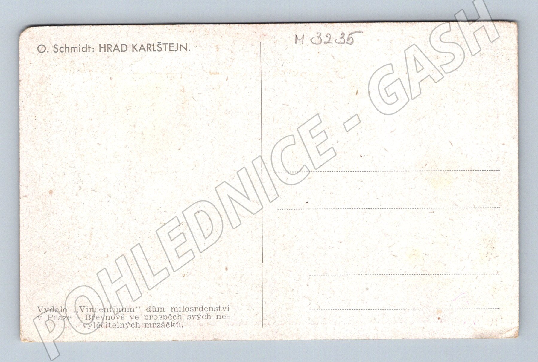 Starší pohlednice s motivem hradu Karlštejn, autor O. Schmidt. Na pohlednici je krásná malovaná scenérie významného českého hradu, zasazeného do přírodního prostředí. Na zadní straně je uvedeno, že vydal Vincentinum – dům milosrdenství v Praze – Břevnově ve prospěch nevyléčitelných mrzáčků. Pohlednice je ve velmi dobrém sběratelském stavu, s minimálními známkami stáří a lehkým opotřebením na okrajích. Ideální doplněk do sbírky historických pohlednic s tematikou českých hradů a památek.