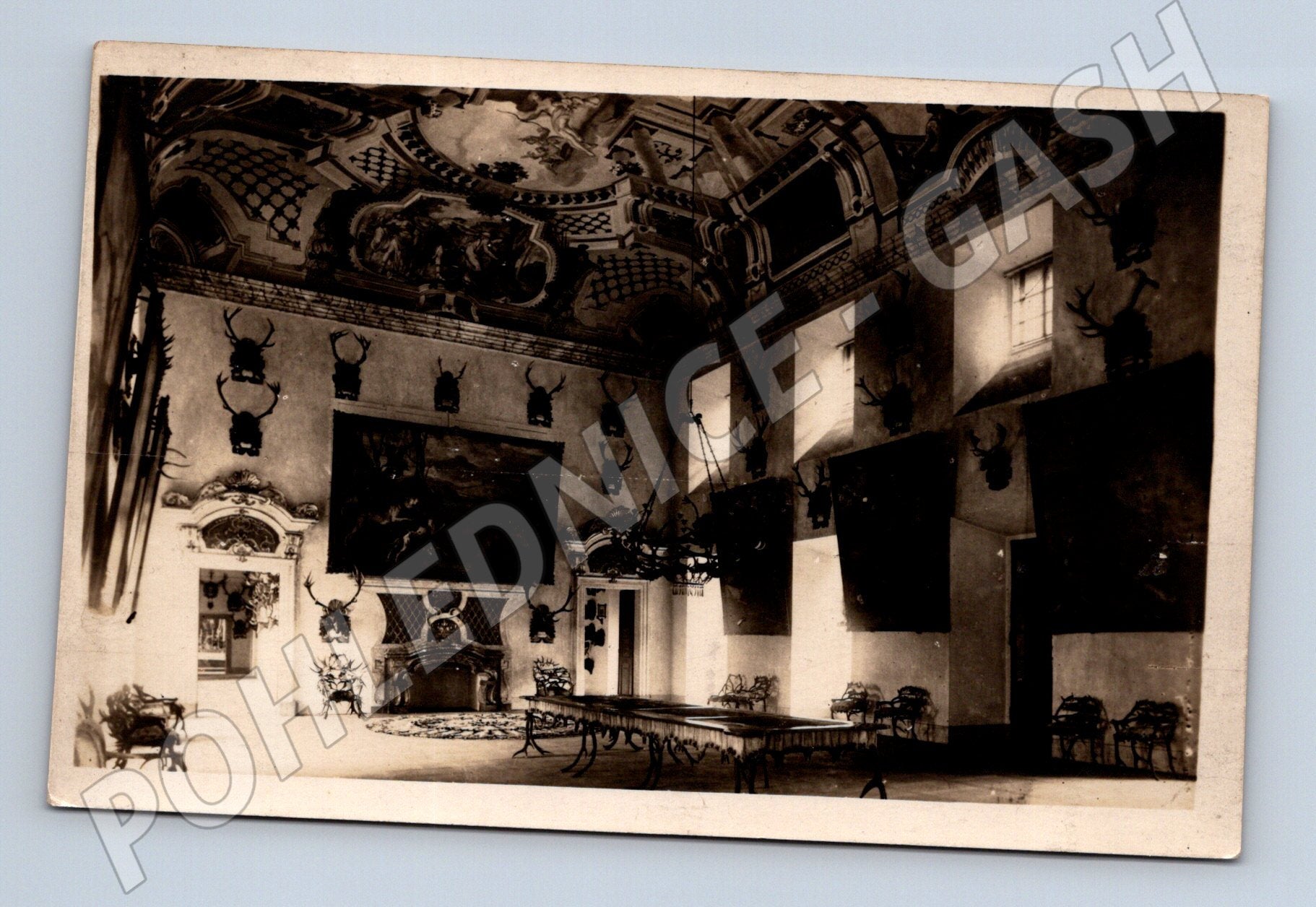 Originální stará pohlednice zachycující hlavní sál v loveckém zámku Ohrady u Hluboké nad Vltavou. Na pohlednici je detailně vyobrazena bohatě zdobená zámecká místnost s loveckými trofejemi, historickým nábytkem, obrazy a štukovým stropem. Zadní strana pohlednice je nepopsaná, pouze s popisem místa a vydavatelem (nákl. F. Vaniček Hluboká n. Vlt.). Pohlednice nese autentické známky stáří a je vhodná pro sběratele historických pohlednic, milovníky architektury a zámeckých interiérů. Formát klasický, černobílý tisk, odhadované stáří první polovina 20. století. Výborný sběratelský stav, pouze lehké opotřebení rohů.