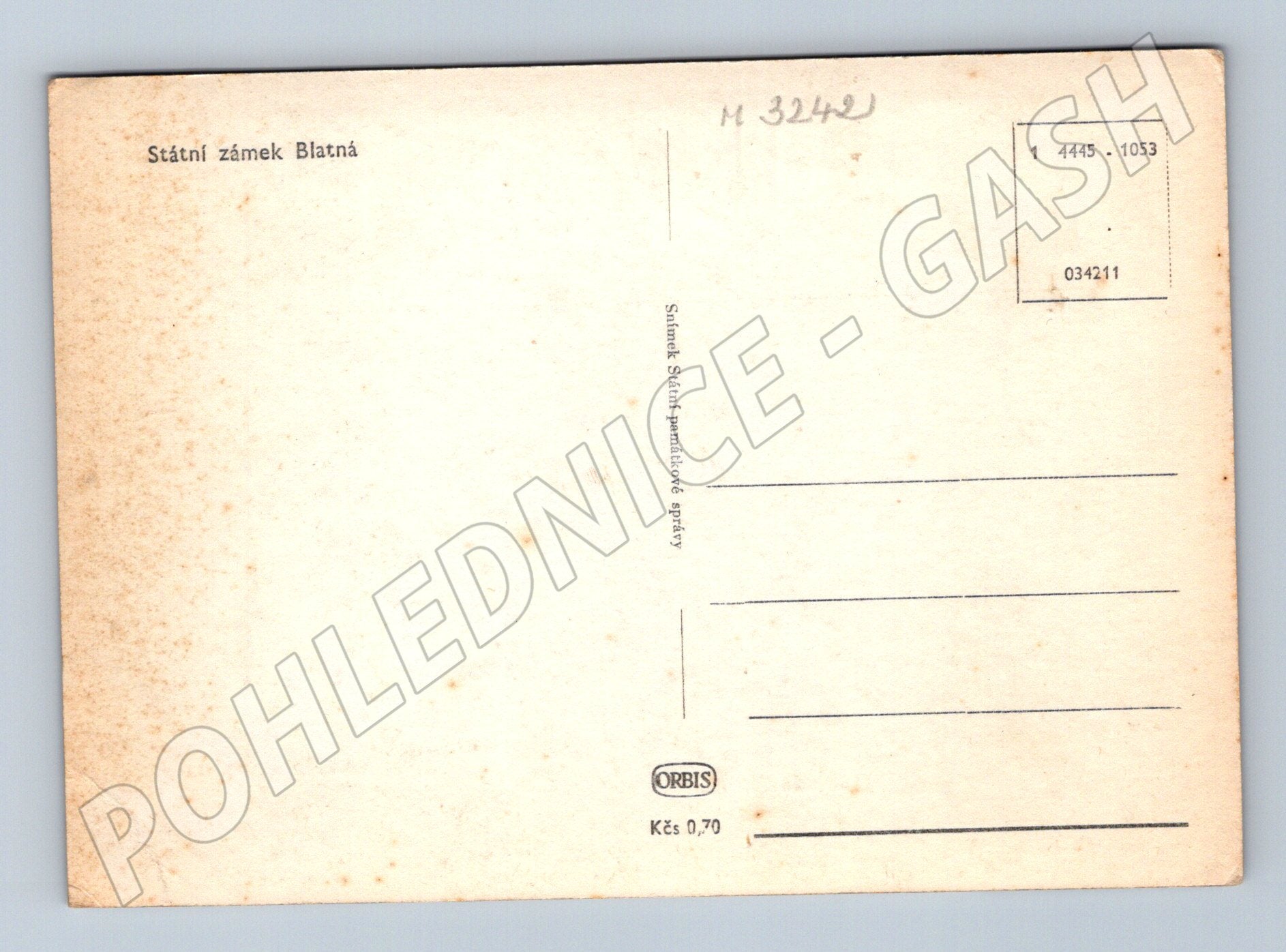 Originální stará pohlednice zobrazující Státní zámek Blatná. Pohlednice je černobílá, pravděpodobně z období první poloviny 20. století. Na zadní straně je označení Státní zámek Blatná , poštovní rozdělení a drobná patina stáří. Vydavatel ORBIS, cena 0,70 Kčs, číslo 4445-1053. Stav odpovídá stáří – drobné známky opotřebení, mírné zažloutnutí a flíčky na zadní straně. Pohlednice je vhodná do sbírky, pro milovníky historie i architektury památek.