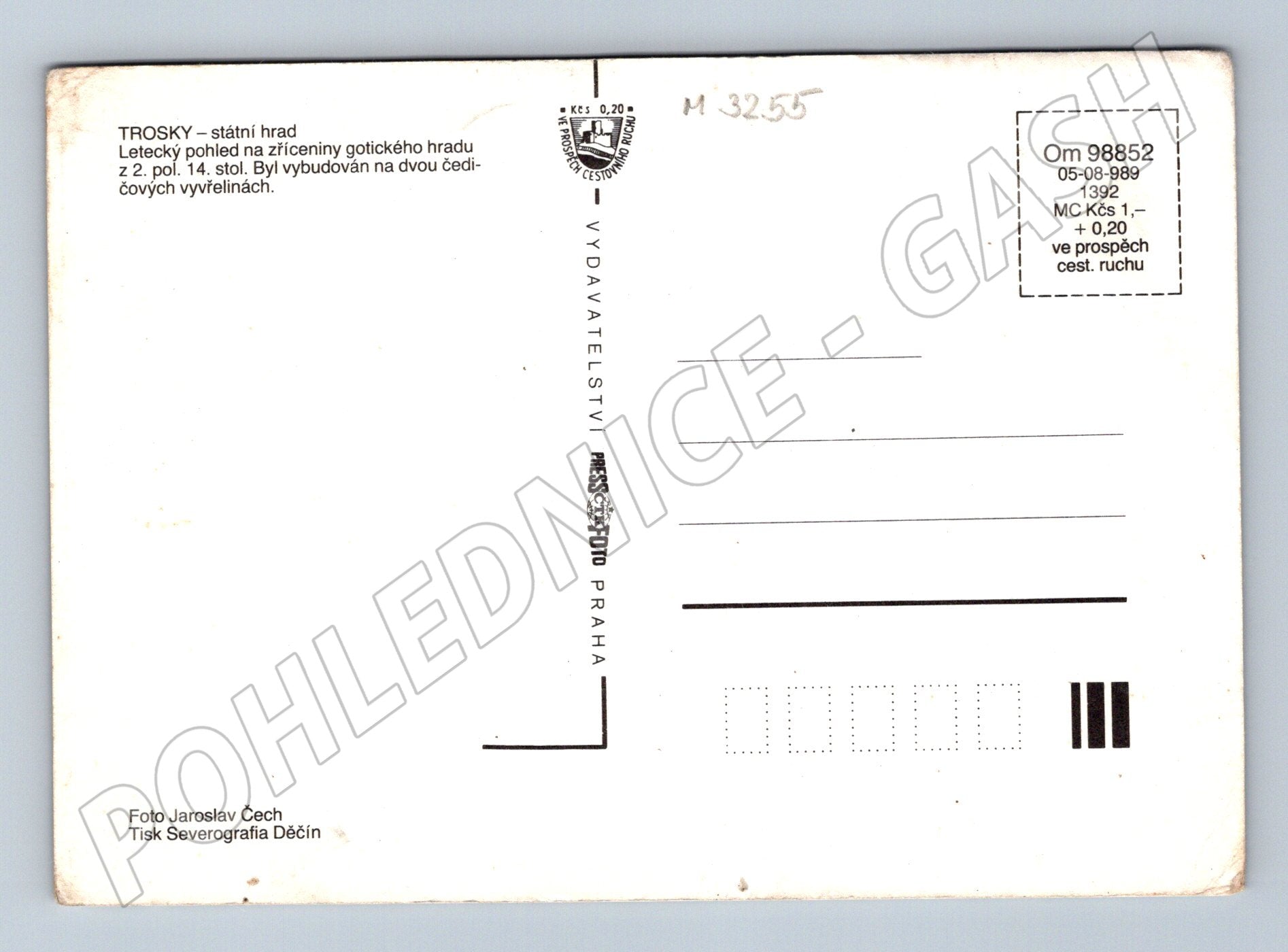 Originální pohlednice se státním hradem Trosky – ikonickou zříceninou gotického hradu ze 2. poloviny 14. století postavenou na dvou čedičových vyvřelinách v Českém ráji. Na přední straně pohlednice je letecký pohled na celý areál hradu i okolní krajinu. Pohlednice pochází z ČSSR (vydavatel Severografia Děčín, foto Jaroslav Čech), na zadní straně stručný popis historie hradu. Ve stavu odpovídajícím stáří – lehké otlaky na okrajích. Skvělý doplněk pro sběratele pohlednic i milovníky českých památek.