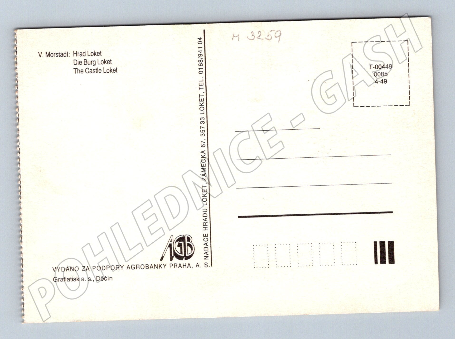 Nabízím pohlednici s vyobrazením hradu Loket, na základě historické kresby V. Morstadta. Pohlednice zachycuje romantický pohled na město Loket s dominantou hradu stojícího na skalnatém ostrohu, obklopeného malebnou krajinou a řekou. Mezi další detaily patří historická zástavba, most a postavy lidí v dobovém oděvu. Na zadní straně pohlednice je uveden popis v češtině, němčině a angličtině (Hrad Loket / Die Burg Loket / The Castle Loket) a informace o vydavateli. Pohlednice nebyla použita, je čistá a ve skvělém stavu, vhodná pro sběratele či milovníky historie a architektury.
