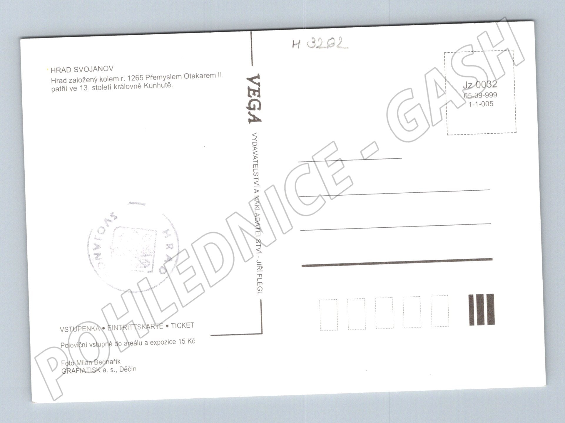 Originální pohlednice s motivem hradu Svojanov. Hrad Svojanov byl založen kolem roku 1265 Přemyslem Otakarem II. a ve 13. století patřil královně Kunhutě. Pohlednice je zachovalá, bez popisu, vhodná pro sběratele i milovníky historie. Na přední straně pohlednice je barevná fotografie s pohledem na areál hradu a erbem. Zadní strana obsahuje základní informace o hradu, prostor pro adresu a známku, razítko a údaj o vydavateli (Vega). Foto Milan Bednařík, GrafaTisk Děčín. Pohlednice může sloužit i jako turistická vstupenka do areálu hradu.