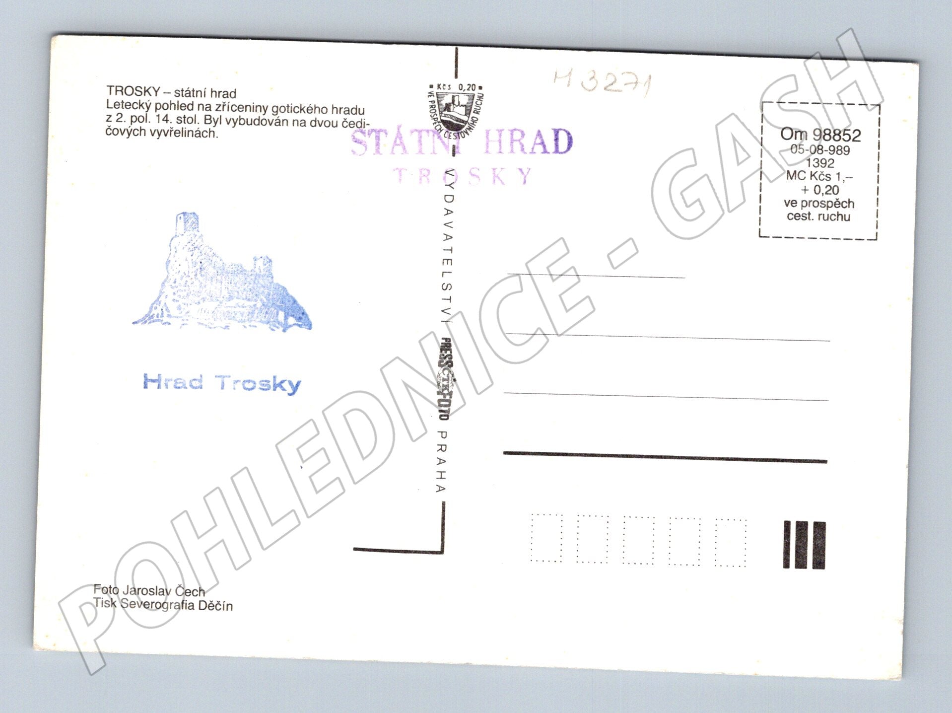Originální pohlednice s leteckým pohledem na zříceninu gotického hradu Trosky. Hrad Trosky, dominantní památka v Českém ráji, pochází ze 14. století a byl vystavěn na dvou čedičových vyvřelinách. Pohlednice je ve velmi dobrém stavu, neprošlá poštou, s krátkým historickým popisem na zadní straně. Ideální sběratelský kousek pro milovníky českých hradů a historických památek. Foto: Jaroslav Čech, tisk Severografia Děčín.