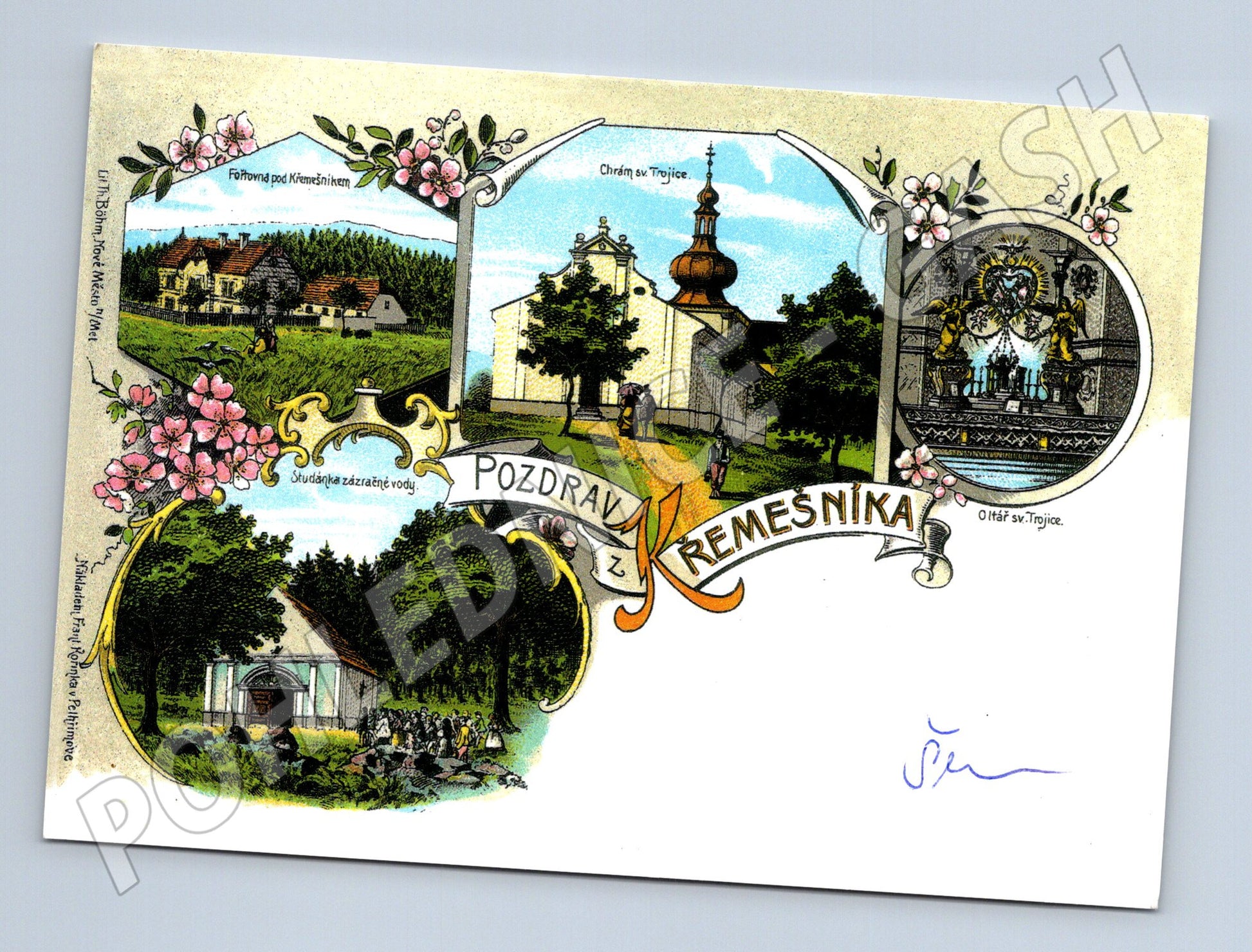 Historická pohlednice s motivem Křemešníku, malebného poutního místa v Česku. Na pohlednici jsou vyobrazeny různé pohledy na místní pamětihodnosti: chrám sv. Trojice, studánka zázračné vody a další významné objekty v okolí Křemešníku. Barevná litografie je doplněna dekorativními květinovými prvky a nápisem Pozdrav z Křemešníka . Pohlednice je nepopsaná a ve velmi dobrém stavu. Zadní strana je čistá, připravena k odeslání nebo k zařazení do sbírky.