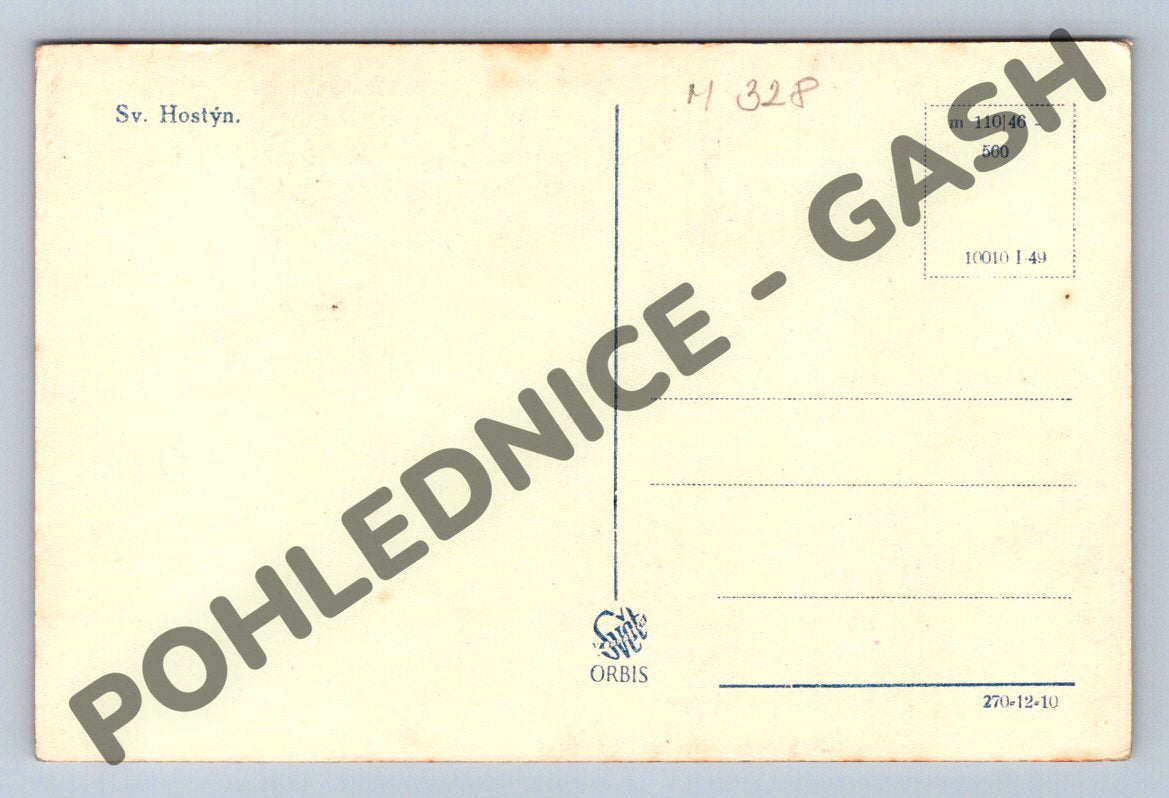 Originální černobílá pohlednice zachycující poutní místo Svatý Hostýn. Na fotografii je dominantní bazilika Nanebevzetí Panny Marie zasazená uprostřed lesů a kopcovité krajiny Hostýnských vrchů. Pohlednice je neprošlá poštou, nepsaná, ve velmi dobrém stavu, pouze drobné známky stáří. Vydáno nakladatelstvím Orbis, vlevo na zadní straně označení Sv. Hostýn a číselné označení pohlednice. Ideální položka pro sběratele pohlednic s tématikou českých památek a poutních míst.