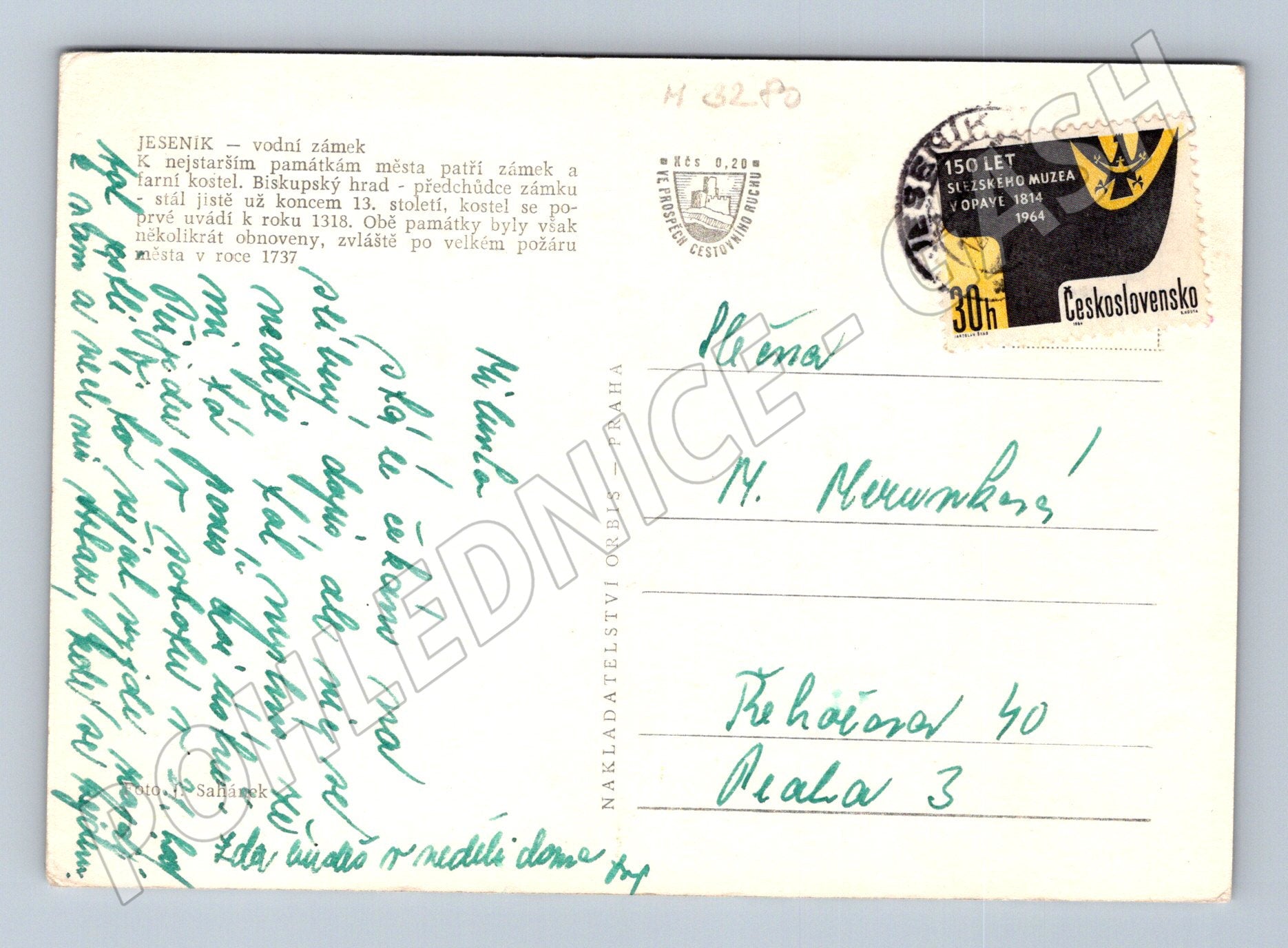 Originální pohlednice z Jeseníku zachycující vodní zámek a farní kostel. Patří mezi nejstarší památky města Jeseník, přičemž biskupský hrad figuruje již od 13. století a kostel se poprvé připomíná v roce 1318. Obě stavby byly několikrát obnovovány, zejména po velkém požáru města v roce 1737. Na pohlednici je použita dobová známka Československo z roku 1964 k 150. výročí Slezského muzea v Opavě. Pohlednice je popsána a prošla poštou. Vhodná do sbírky historických pohlednic se zaměřením na české zámky a architekturu.