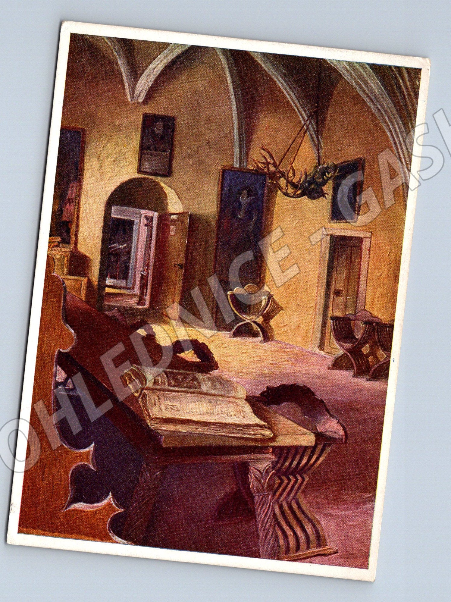 Originální pohlednice zobrazující interiér Rytířského sálu na hradě Buchlov u Uherského Hradiště dle malby V. Pernici. Pohlednice zachycuje historickou výzdobu sálu, včetně obrazu, starožitného nábytku a klenutých stropů. Na zadní straně je text s popisem a místem vydání. Výborný stav, bez popisu a bez známky. Ideální k rozšíření sbírky českých hradů a historických interiérů.