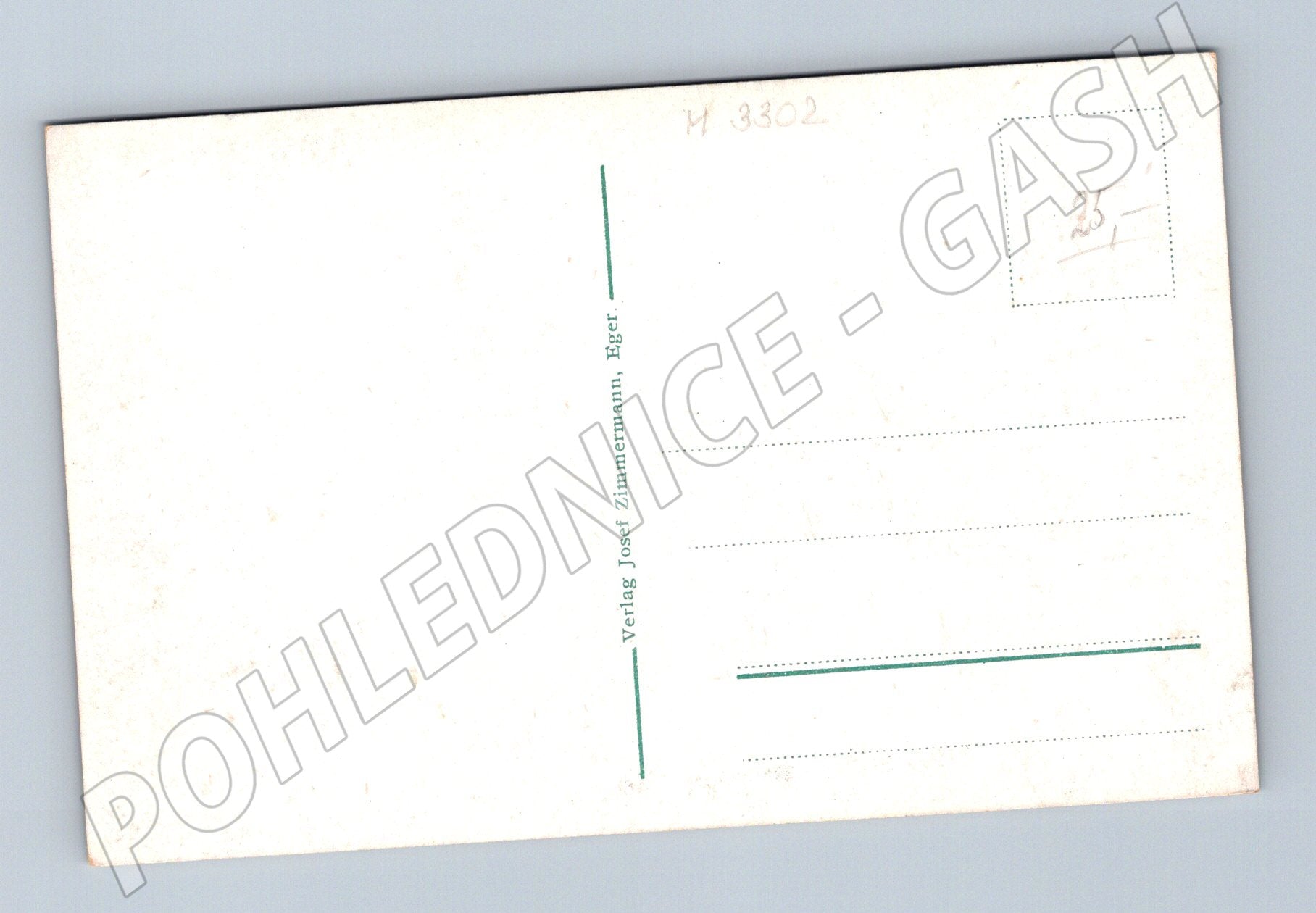 Starobylá pohlednice s vyobrazením hradu Kaiser- und Wenzelsburg v Chebu (Eger). Na lícové straně je barevná kresba původního hradu před jeho zničením. Text v němčině: „Die Kaiser- und Wenzelsburg vor ihrer Zerstörung.“ Zadní strana je čistá, bez psaní a známky, v dolní části natištěn vydavatel Verlag Josef Zimmermann, Eger. Formát klasické staré pohlednice, sběratelský kousek vhodný do kolekce historických pohlednic či jako dekorace.