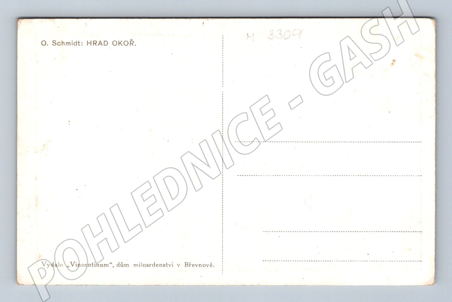 Nabízím originální starou pohlednici s motivem hradu Okoř, jejímž autorem je O. Schmidt. Krásná malovaná ilustrace zachycuje zříceninu hradu zasazenou do malebné krajiny. Pohlednice nebyla prošlá poštou a je ve velmi dobrém stavu, pouze s mírným opotřebením odpovídajícím stáří. Vydal dům milosrdenství Vincentinum v Břevnově, což zvýrazňuje její sběratelskou hodnotu. Ideální přírůstek do sbírky historických pohlednic zaměřených na české památky, hrady a zámky.