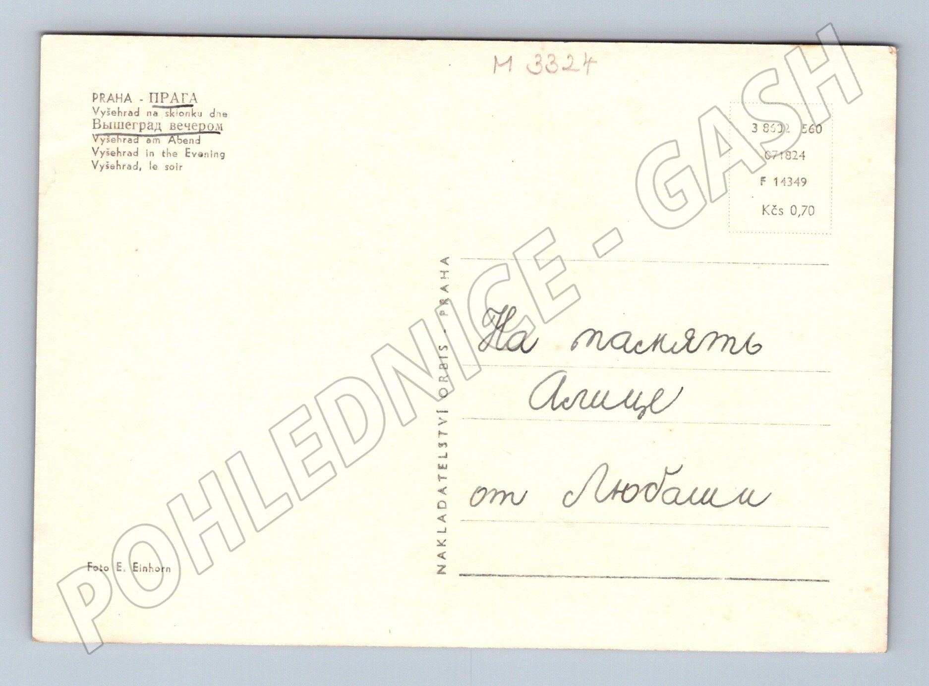 Nabízím originální sběratelskou pohlednici s názvem Vyšehrad na sklonku dne (Vyšehrad večer), zachycující krásný pohled na pražský Vyšehrad při západu slunce. Fotograf E. Einhorn. Pohlednice je vydána nakladatelstvím Orbis Praha. Na zadní straně se nachází ručně psaný vzkaz v ruštině. Pohlednice je ve velmi dobrém stavu, bez výrazného poškození, vhodná pro sběratele i milovníky Prahy a historických pohlednic. Formát menšího rozměru, orientace na šířku.