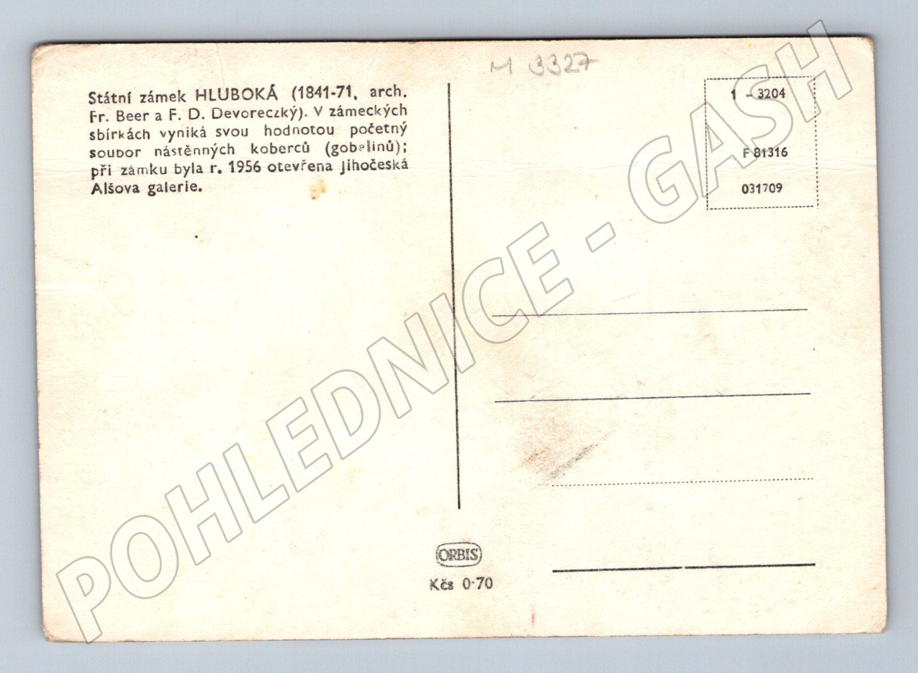 Originální pohlednice zobrazující slavný státní zámek Hluboká. Zámek byl vystavěn v letech 1841–1871 dle návrhu architektů Františka Beera a F. D. Deworeckého. Zámecké sbírky vynikají mimořádnou hodnotou, především velkou kolekcí nástěnných koberců (gobelínů). V roce 1956 byla při zámku otevřena jihočeská Alšova galerie. Pohlednice je ve sběratelském stavu, na rubu drobné známky používání, bez zásadních vad, rozměr klasického malého formátu. Ideální pro milovníky historie a hradů/zámků.