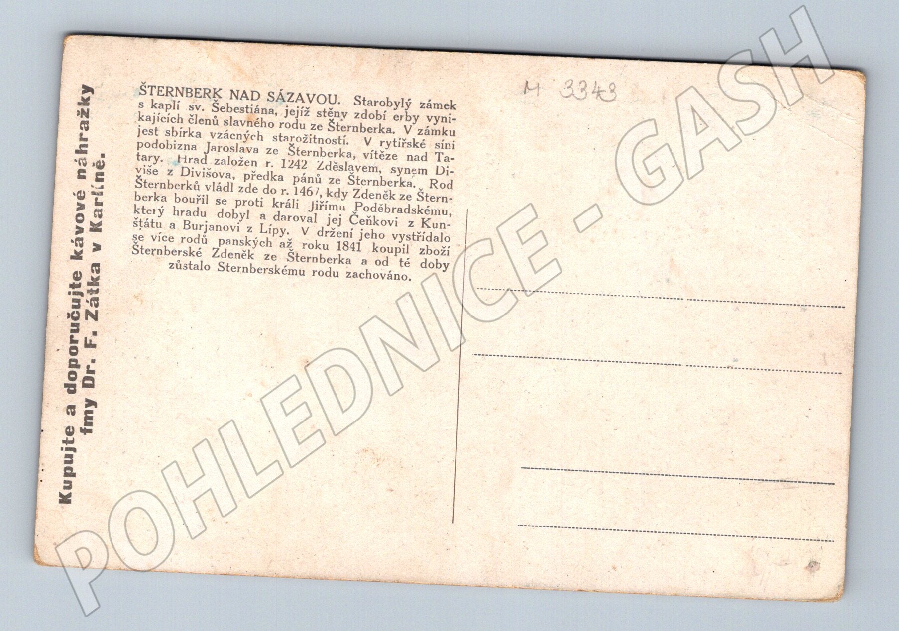Originální historická pohlednice zobrazující pohled na hrad Šternberk nad Sázavou. Na pohlednici je vidět malebná kresba hradu s výraznou architekturou, zasazenou do krajinného rázu s domky a vesnickou zástavbou v popředí. Na zadní straně naleznete podrobné informace o historii hradu Šternberk, jeho zakladateli Jaroslavovi ze Šternberka, významných členech stejnojmenného rodu, kapli sv. Sebestiána a majitelích z řady šlechtických rodin až do 19. století. Pohlednice má klasický rozměr, je psána česky a je v zachovalém sběratelském stavu. Vhodná do sbírky milovníků hradů a historických pohlednic.