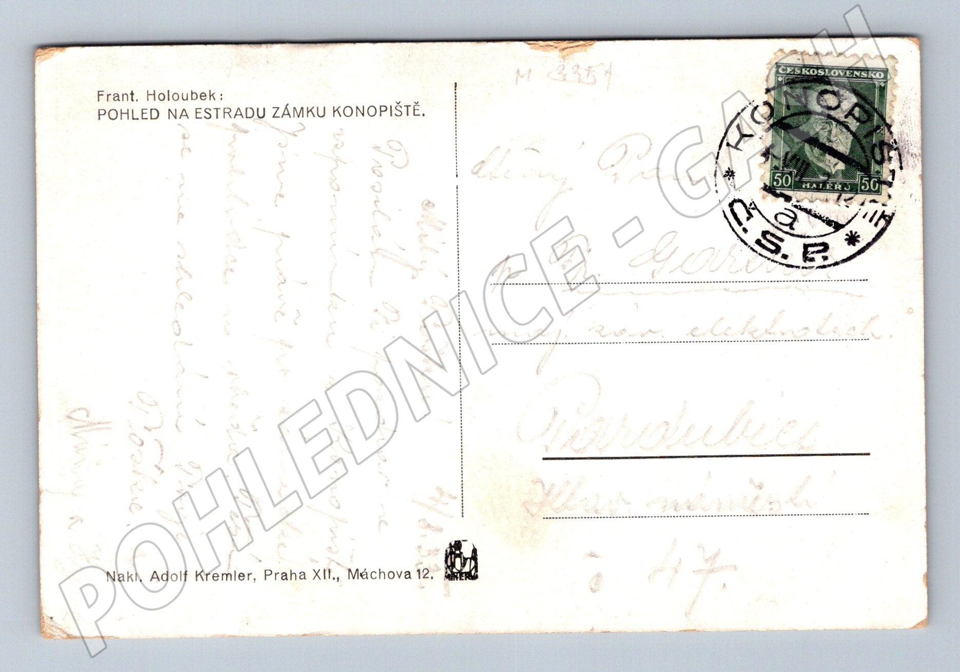 Originální stará pohlednice s barevnou kresbou pohledu na estrádu zámku Konopiště od Františka Holoubka. Pohlednice pochází z vydavatelství Adolf Kremler, Praha XII., Máchova 12. Zadní strana je opatřena známkou a prošla poštou z Konopiště. Zachovalost dobrá, s drobnými známkami stáří a opotřebení po okrajích. Skvělý sběratelský kousek pro milovníky historických památek a českých zámků.