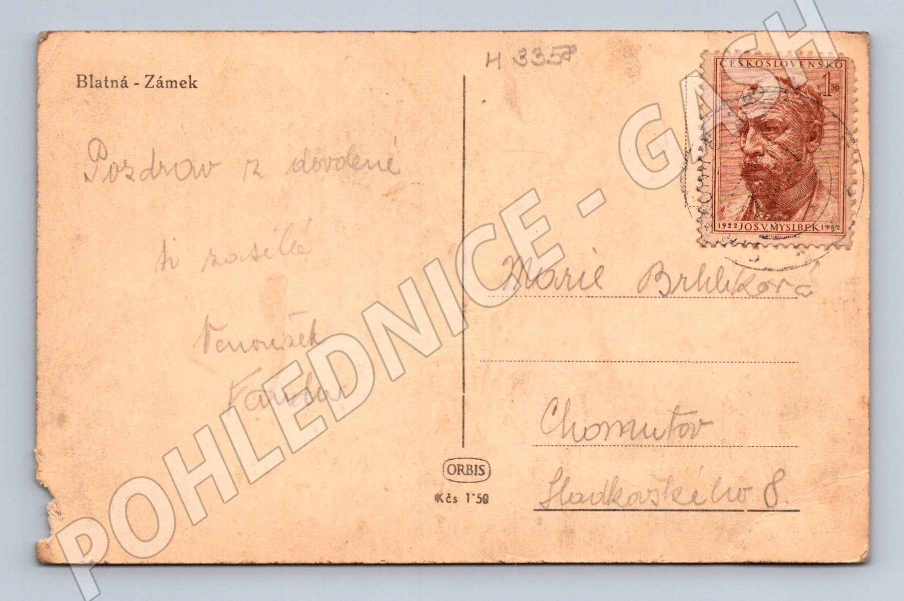 Blatná – Zámek, stará pohlednice, prošlá poštou, 1950