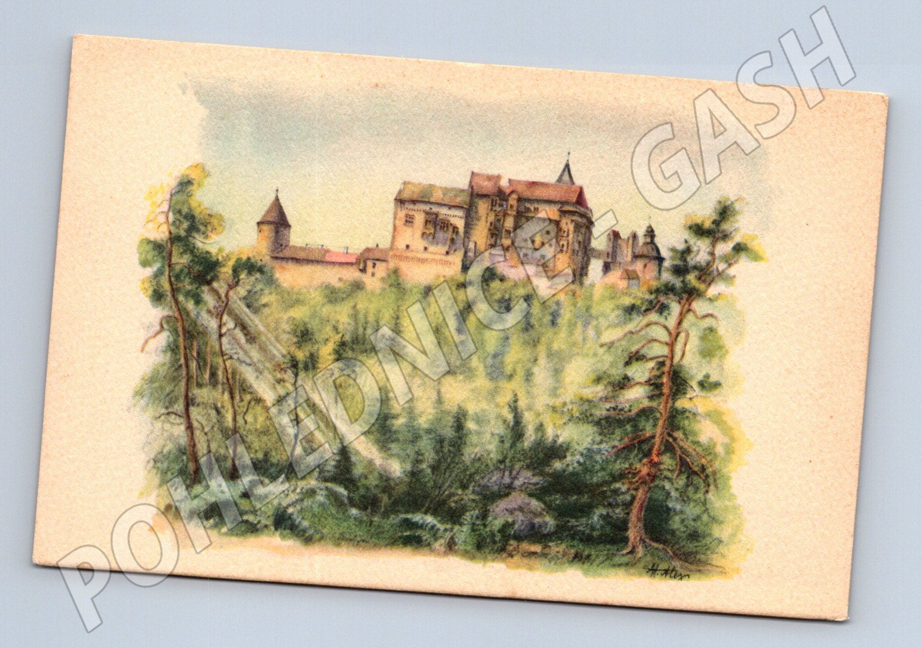 Rozměry: standardní formát pohlednice. Na přední straně barevná kresba s motivem hradu v krajině, vzadu stručný popis v angličtině. Jedinečný sběratelský kus.