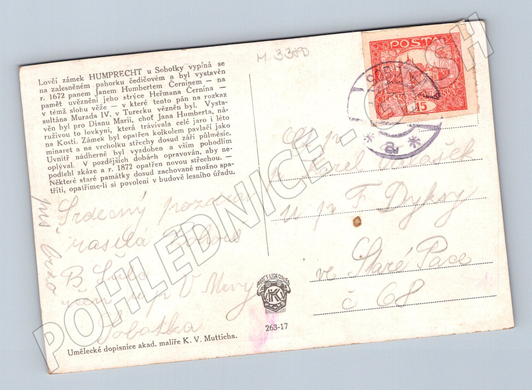 Nabízím originální pohlednici zobrazující Lovčí zámek Humprecht u Sobotky. Pohlednice je ve velmi pěkném stavu, s malovaným motivem zámku v podzimní krajině dle originálu od akad. malíře K. V. Mutticha. Na zadní straně se nachází podrobný popis historie zámku, razítko a známka ČSR. Ideální přírůstek do sbírky historických pohlednic s tematikou hradů a zámků nebo regionální historie. Rozměr klasického formátu, odeslaná poštou, s vlastnoručním vzkazem.