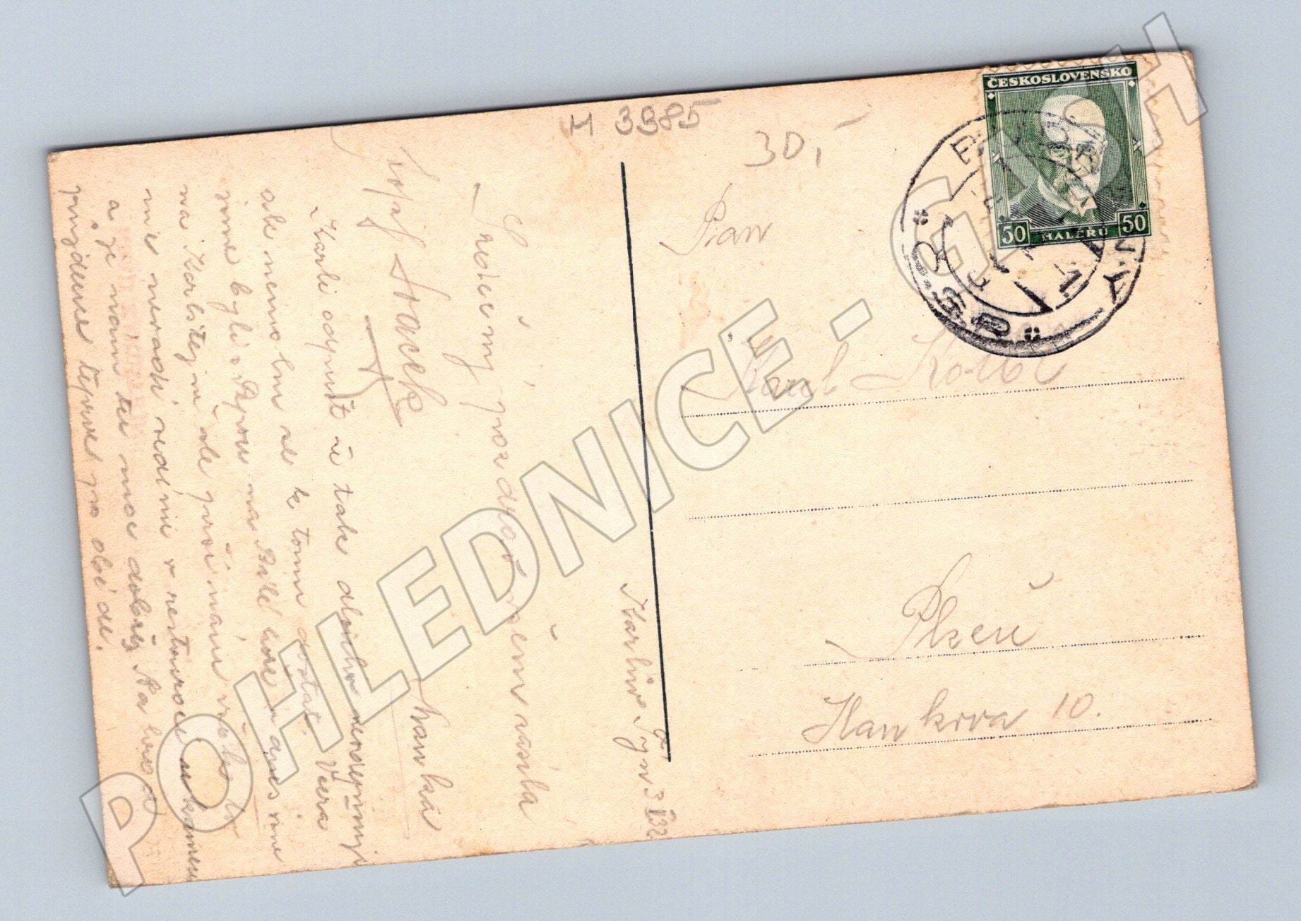 Originální stará pohlednice zobrazující slavný hrad Karlštejn. Pohlednice je kolorovaná, na lícové straně je jasně čitelný nápis Hrad Karlštejn . Jedná se o zaslaný exemplář, na rubu je dochovaná poštovní známka z období Československa s portrétem Tomáše G. Masaryka a ručně psaný text se jménem adresáta a adresou včetně poštovního razítka. Tento sběratelský kousek je vhodný pro milovníky historie, sběratele pohlednic i zájemce o české hrady a zámky. Stav viz foto; mírné známky stáří a používání, rohy nepatrně opotřebované.