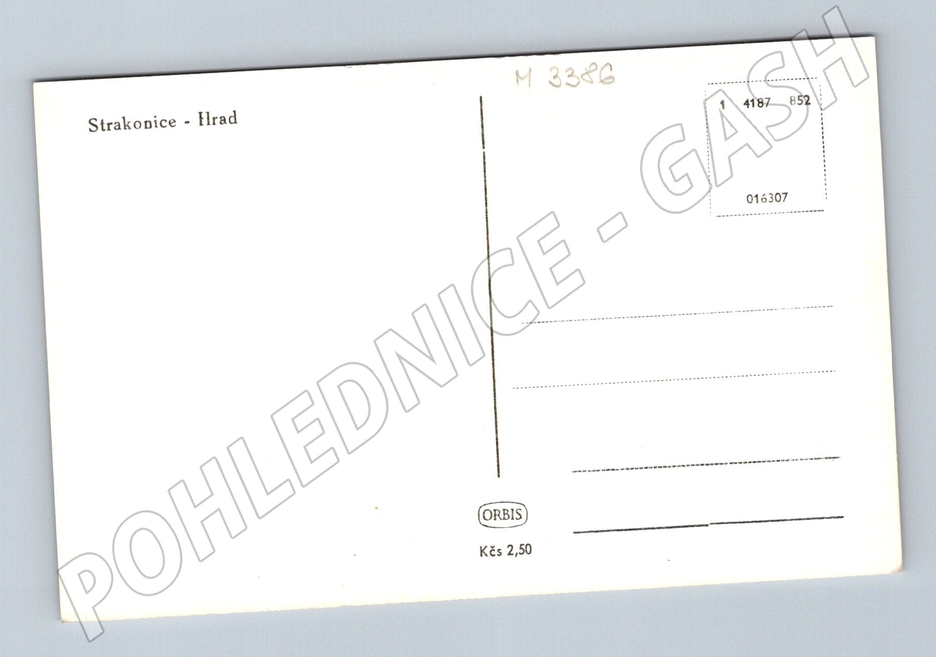 Originální černobílá pohlednice zobrazující historický hrad ve Strakonicích. Na přední straně je detailní záběr na masivní zdi, věže a architekturu hradu, včetně okolní zeleně. Na zadní straně je nápis Strakonice - hrad , pohlednice nebyla použitá a je ve velmi dobrém stavu. Vydáno nakladatelstvím ORBIS, cena 2,50 Kčs. Jedná se o krásný sběratelský kousek vhodný do každé sbírky pohlednic českých hradů a zámků.