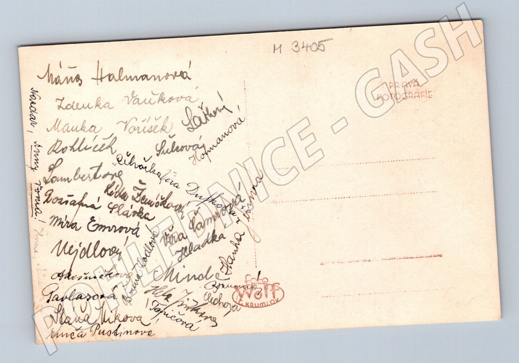 Originální černobílá pohlednice s motivem známého českého zámku v Českém Krumlově. Pohlednice má na přední straně fotografii zámku s věžemi a řekou v popředí. Na zadní straně jsou autentické ručně psané podpisy, což dodává pohlednici jedinečnou sběratelskou hodnotu. Jedná se o pravou fotografii, stav viz foto – velmi dobrý, neprošlá poštou. Pohlednice je vhodná pro sběratele historických pohlednic a milovníky památek.